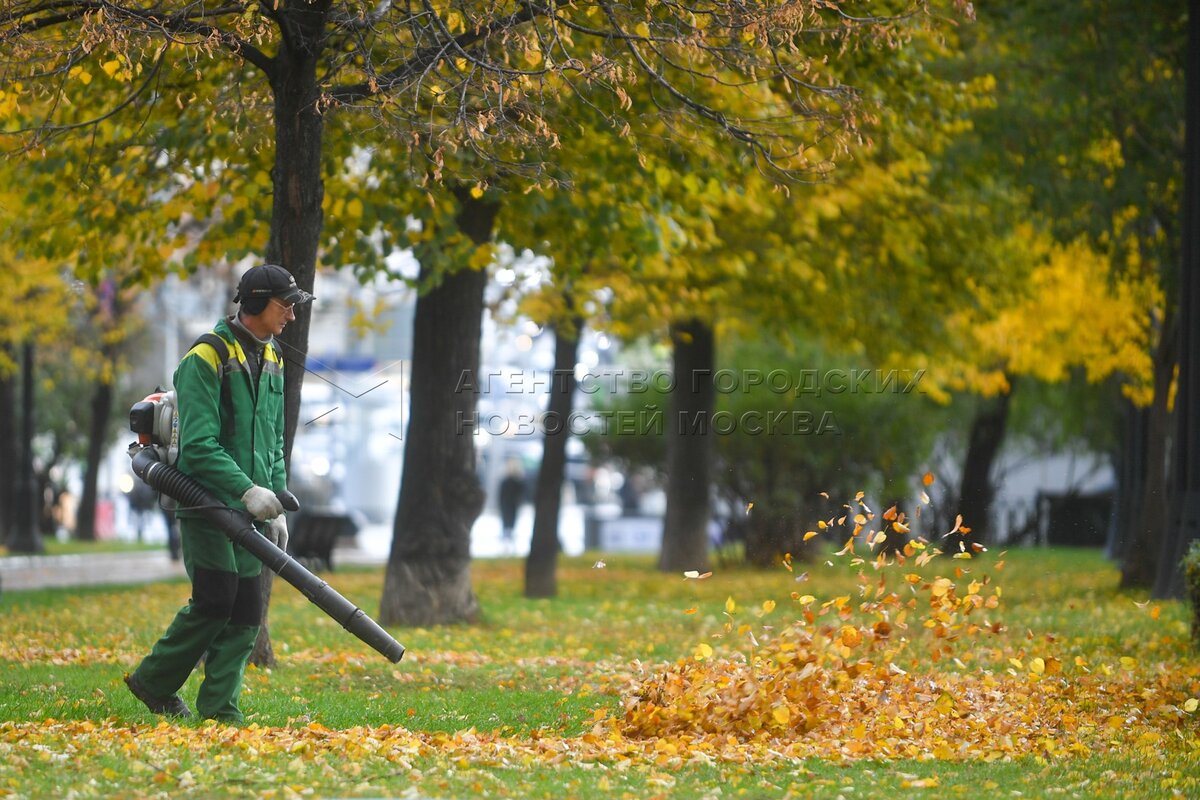 Осень в Москве. Уборка опавшей листвы в парке.