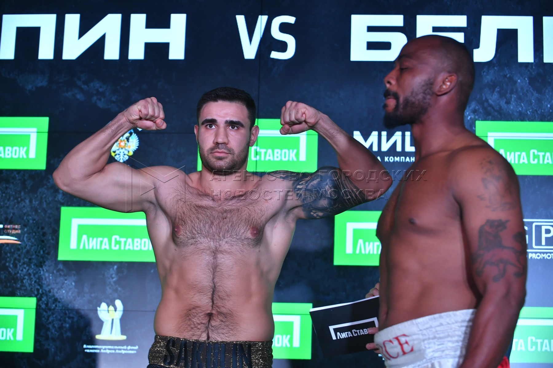 Боксеры Тимур Сакулин (Россия) (слева) и Уиллбифорс Шихепо (Намибия) во время взвешивания бойцов матчевой встречи по боксу между фанатами «Спартака» и «Динамо».