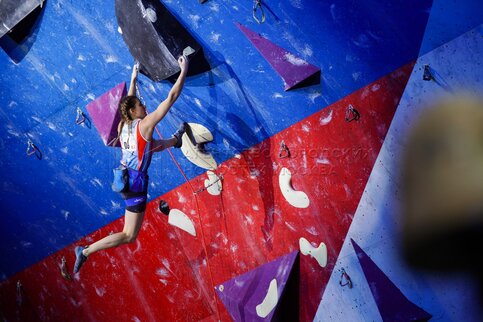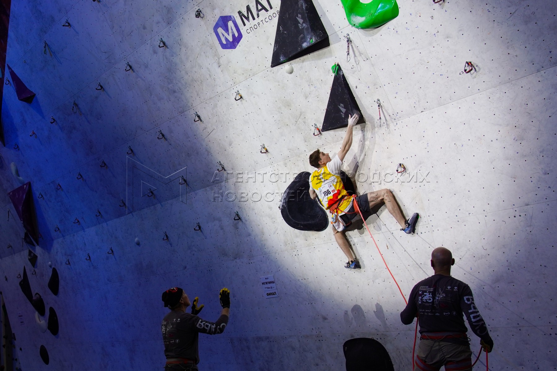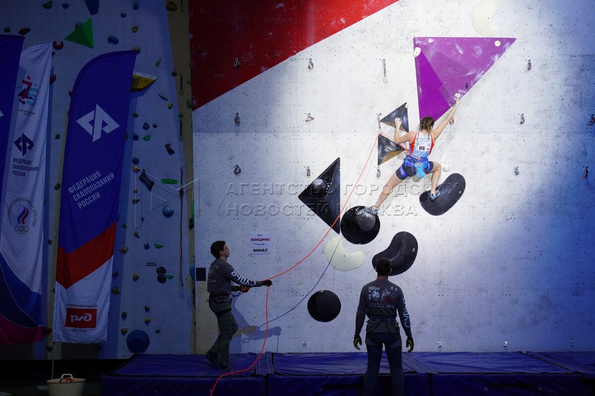 - Описание: Финалы в дисциплине «лазание на трудность» на всероссийских соревнованиях «Кубок 75-летия скалолазания» в крытом легкоатлетическо-футбольном комплексе ЦСКА.