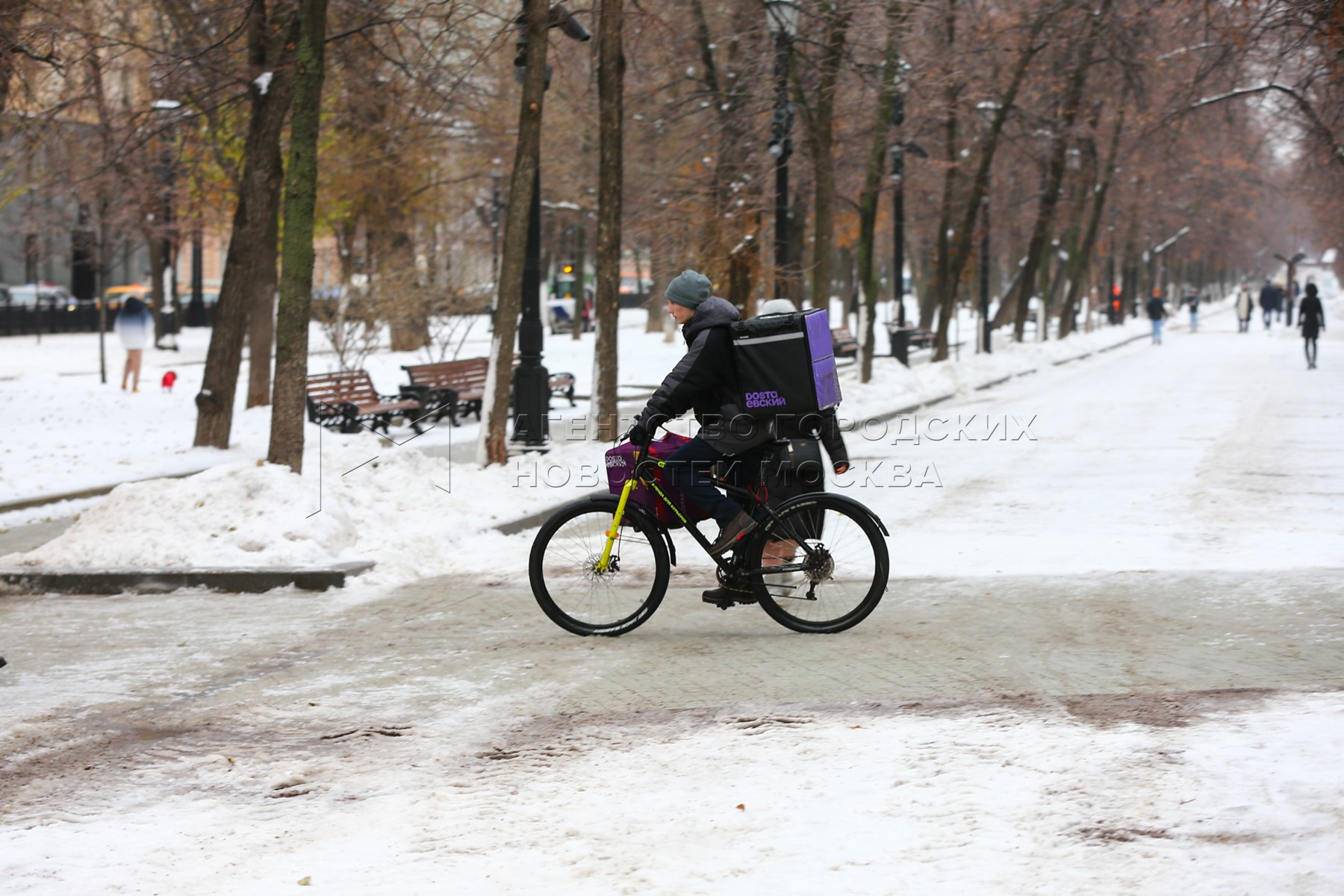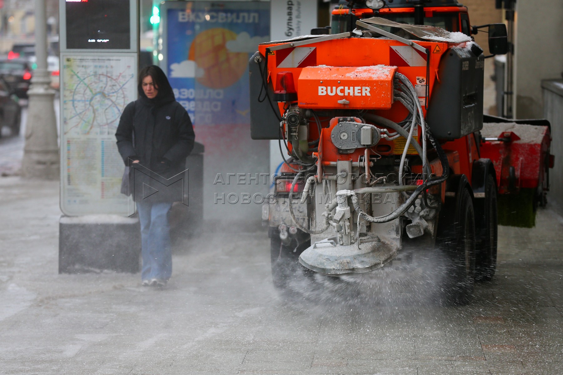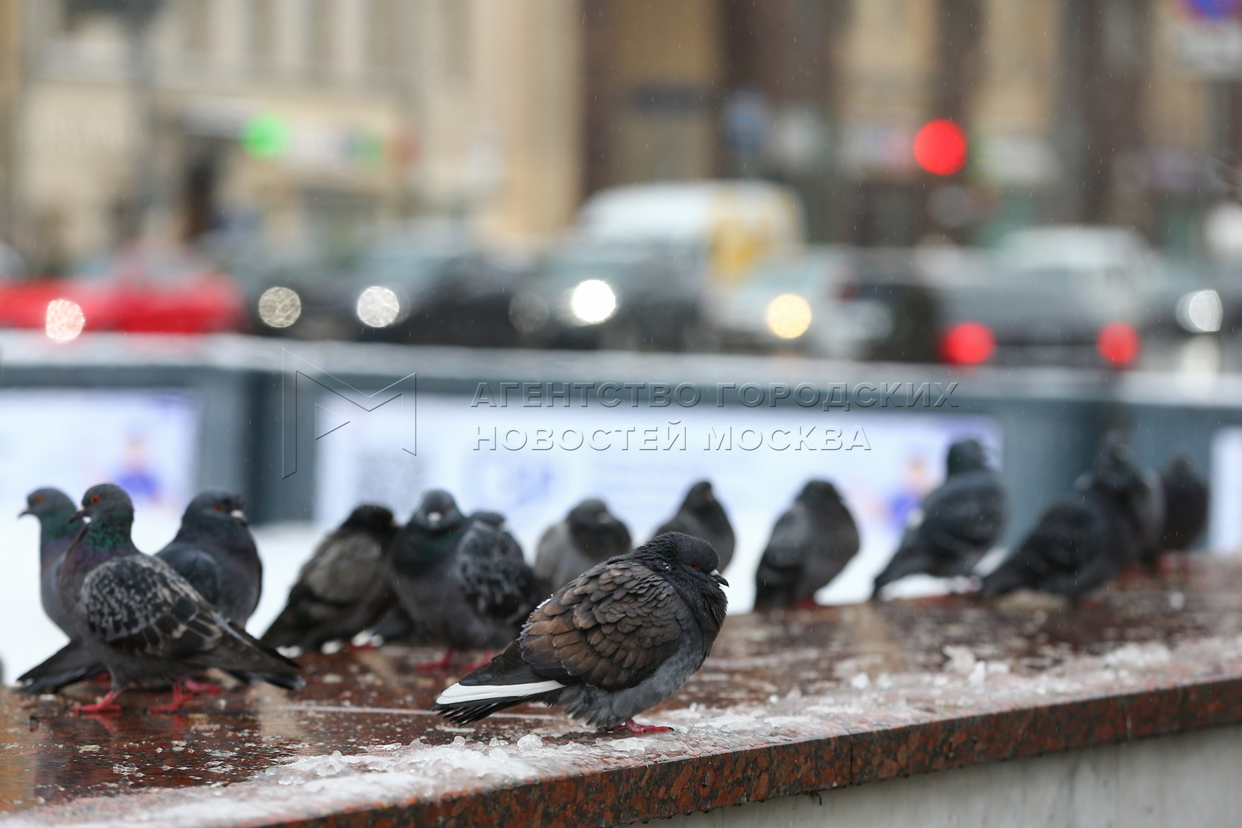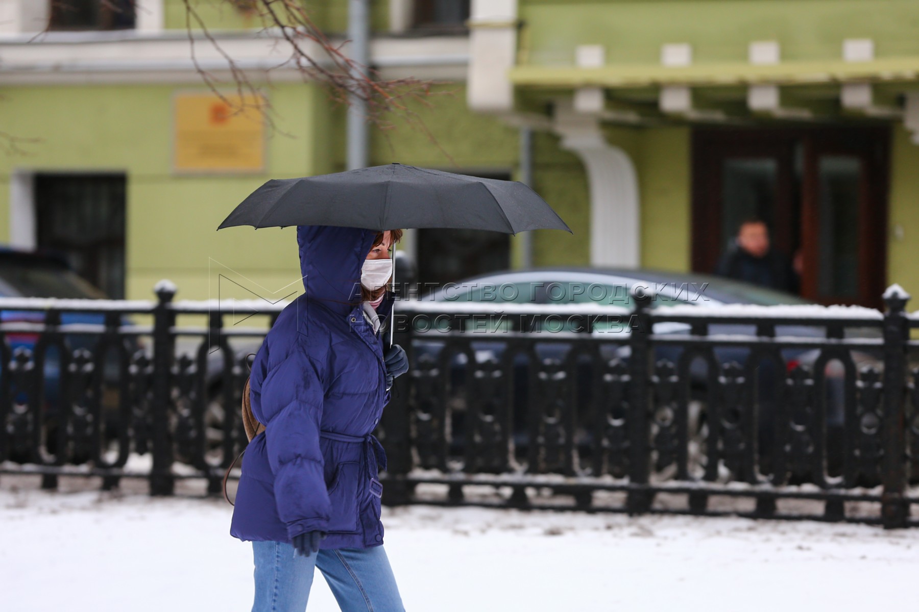 Последствия ледяного дождя в Москве. Собаки в комбинезонах на прогулке.