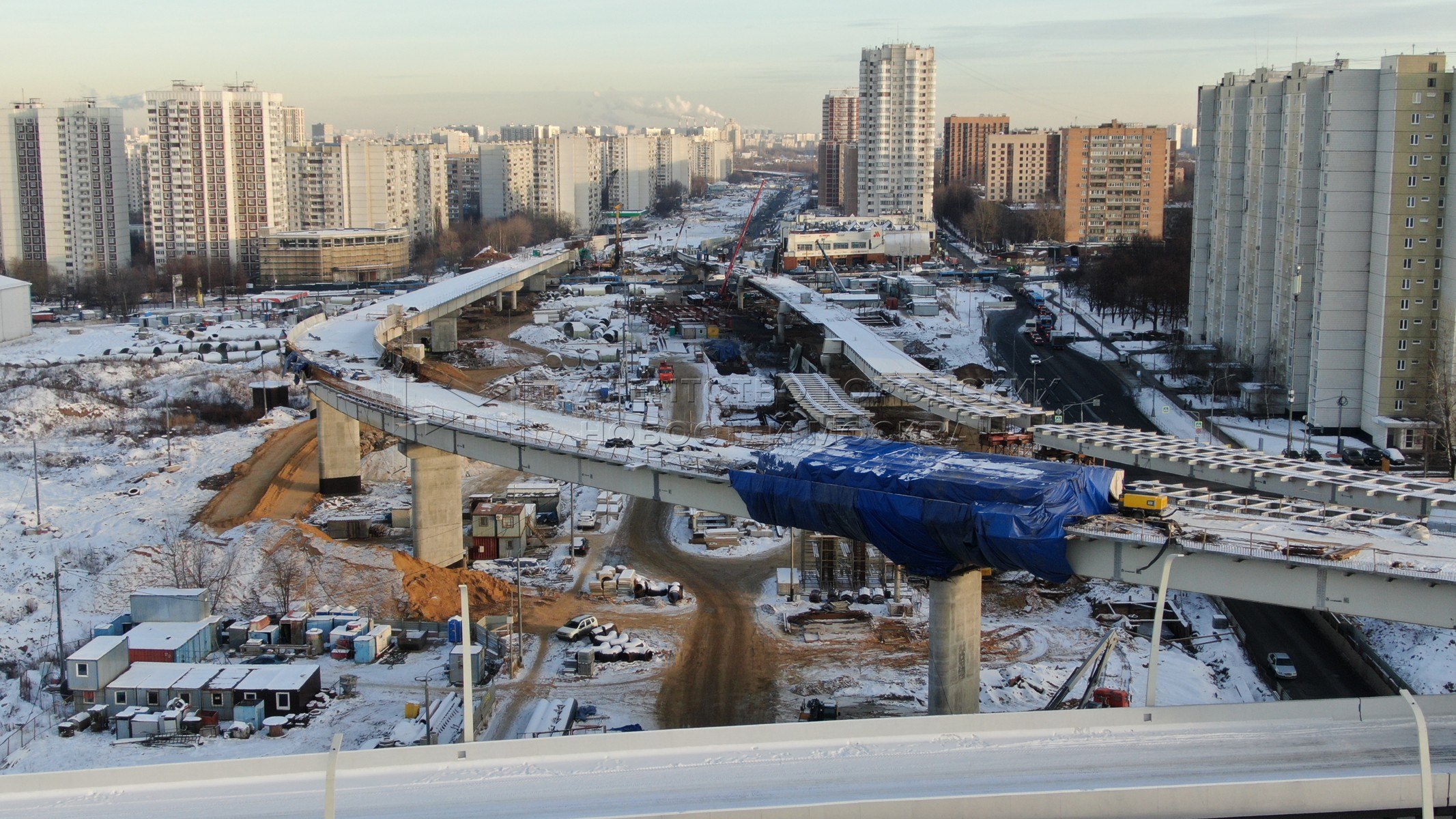 Вид с квадрокоптера на ход работ по строительству многоуровневой транспортной развязки Московского скоростного диаметра (МСД) с Южной рокадой в районе ул. Кантемировская и Пролетарского проспекта.