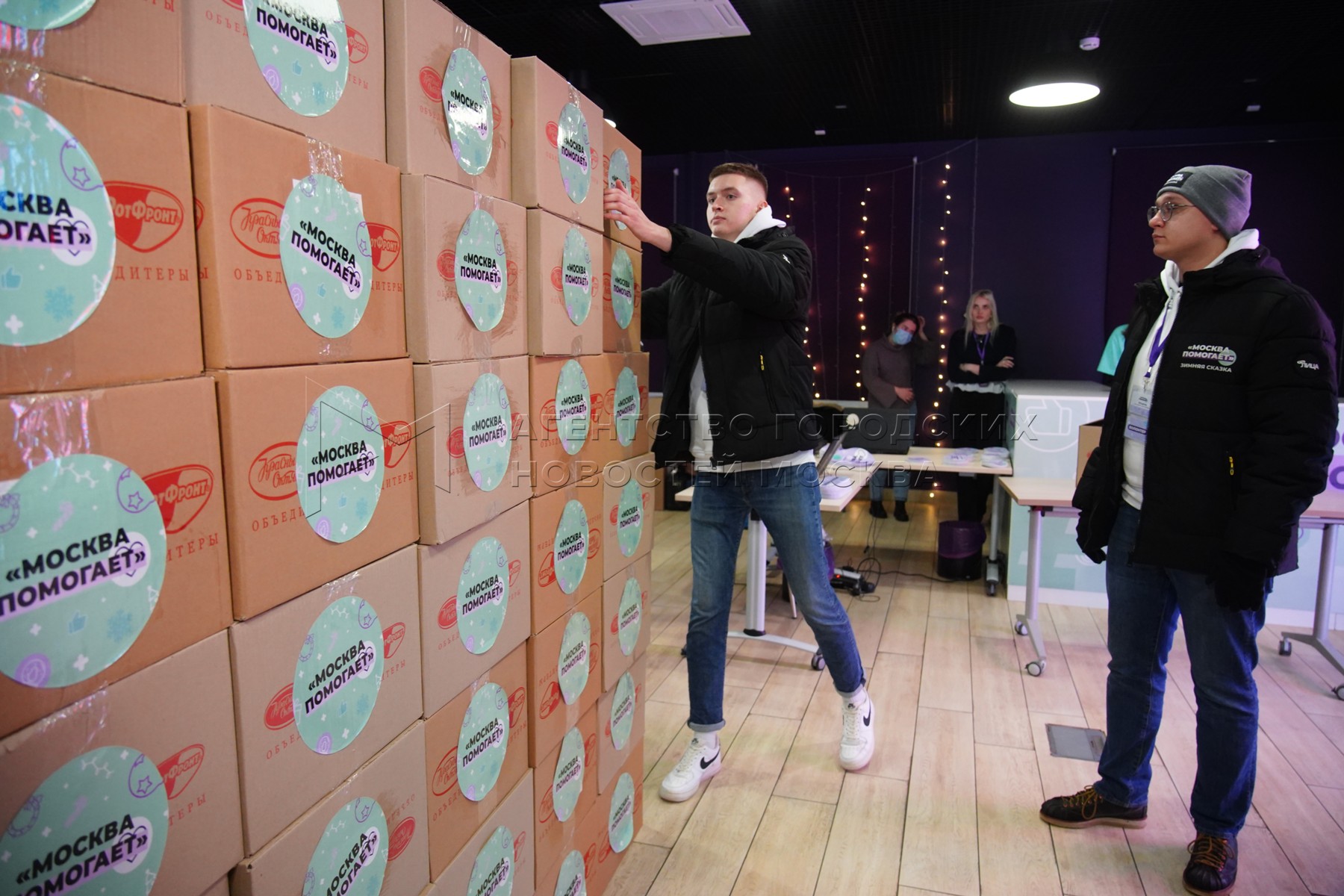 Отправка новогодних подарков из ресурсного центра «Мосволонтер» на Ленинградском проспекте в Донецкую и Луганскую народные республики в рамках акции «Москва помогает».