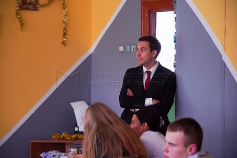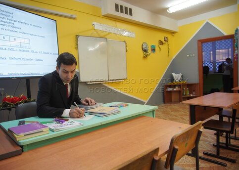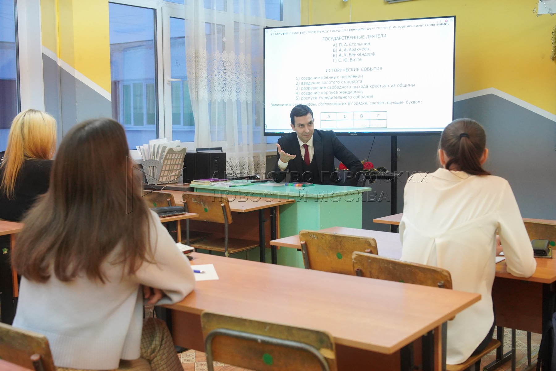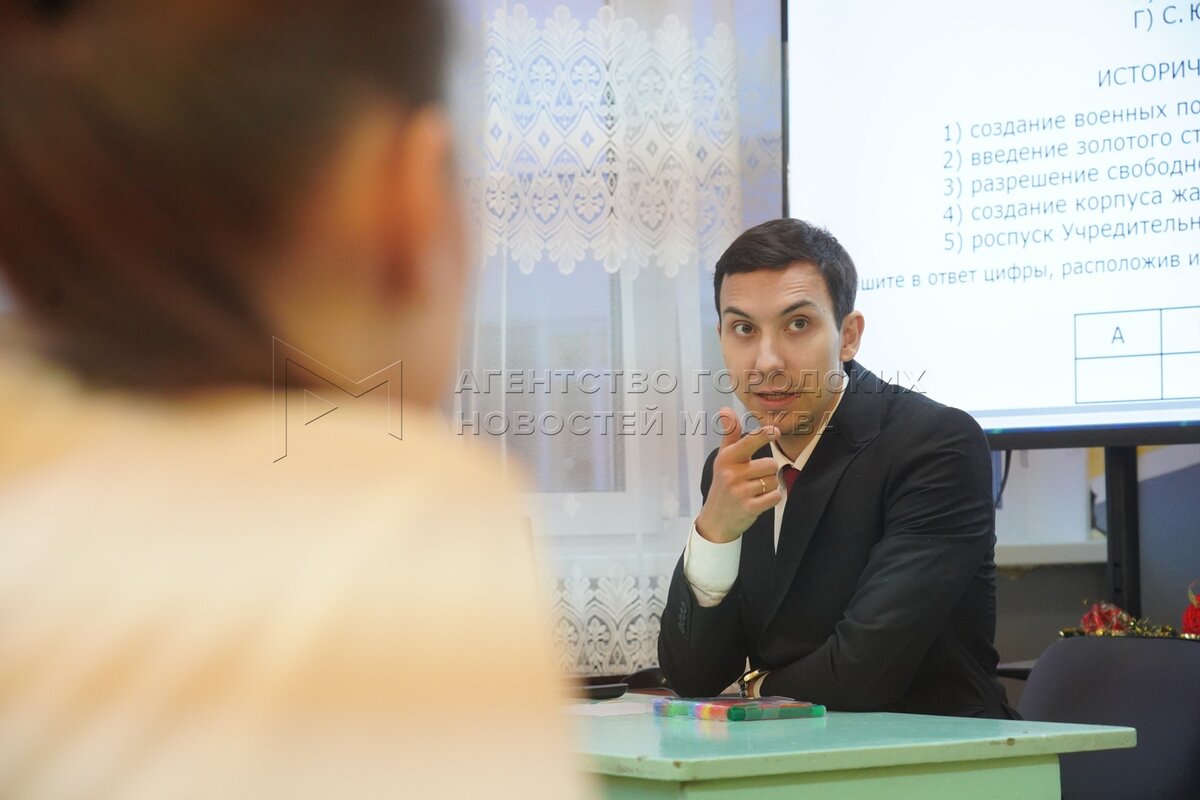 • Описание: Победитель конкурса «Учитель года России» Дмитрий Лутовинов во время урока истории и мировой художественной культуры в школе №16 в Орехово-Зуево.