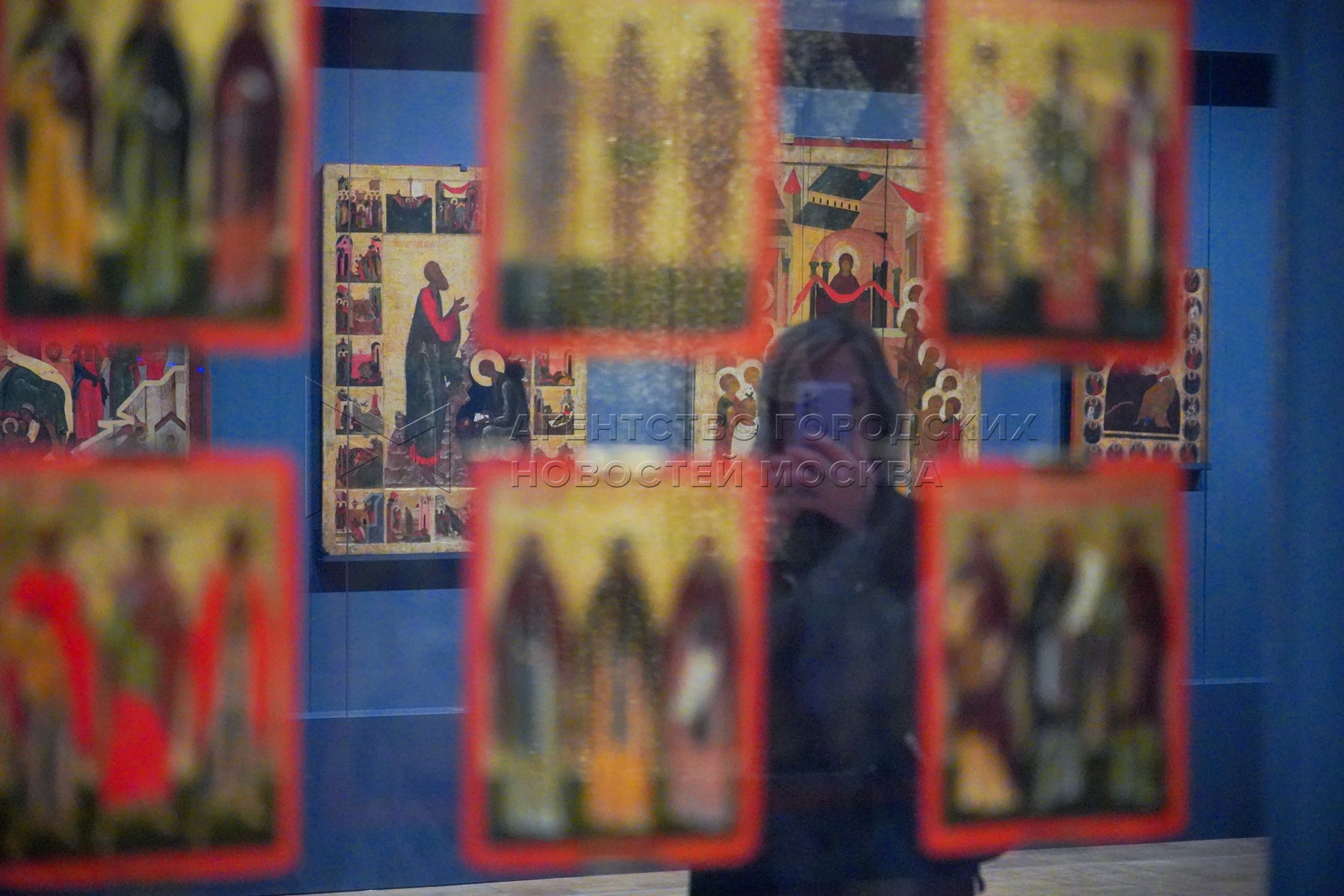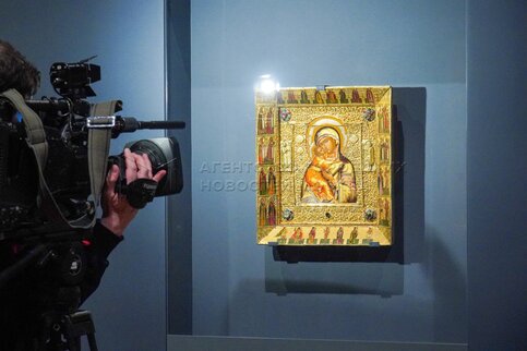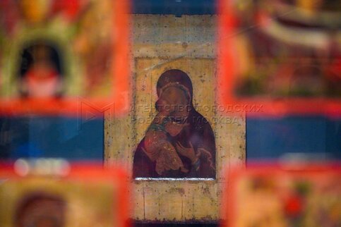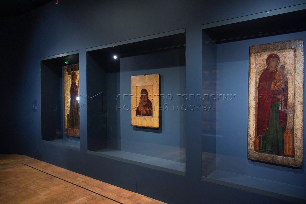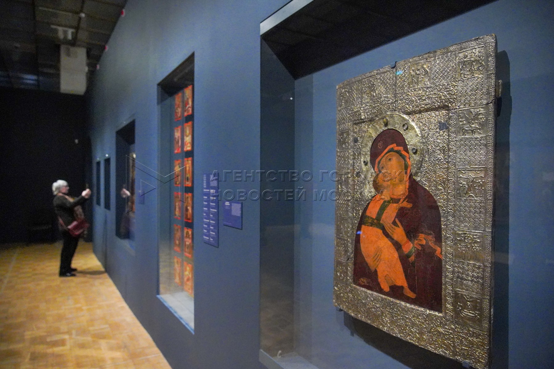 - Описание: Икона Андрея Рублева «Богоматерь Владимирская» (конец XIV-начало XV в.) на предпоказе выставки «Великое княжество. Сокровища Владимиро-Суздальской земли» в выставочном зале в здании Государственной Третьяковской галереи на ул. Крымский Вал.