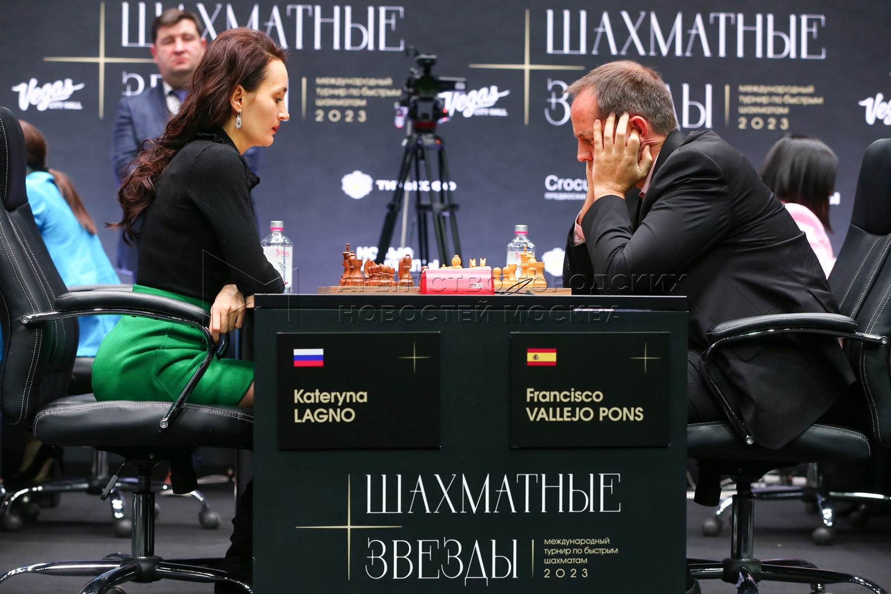 • Описание: Гроссмейстеры Катерина Лагно (Россия) и Франсиско Вальехо (Испания) на Международном турнире «Шахматные звезды - 2023» в концертном зале Vegas City Hall.