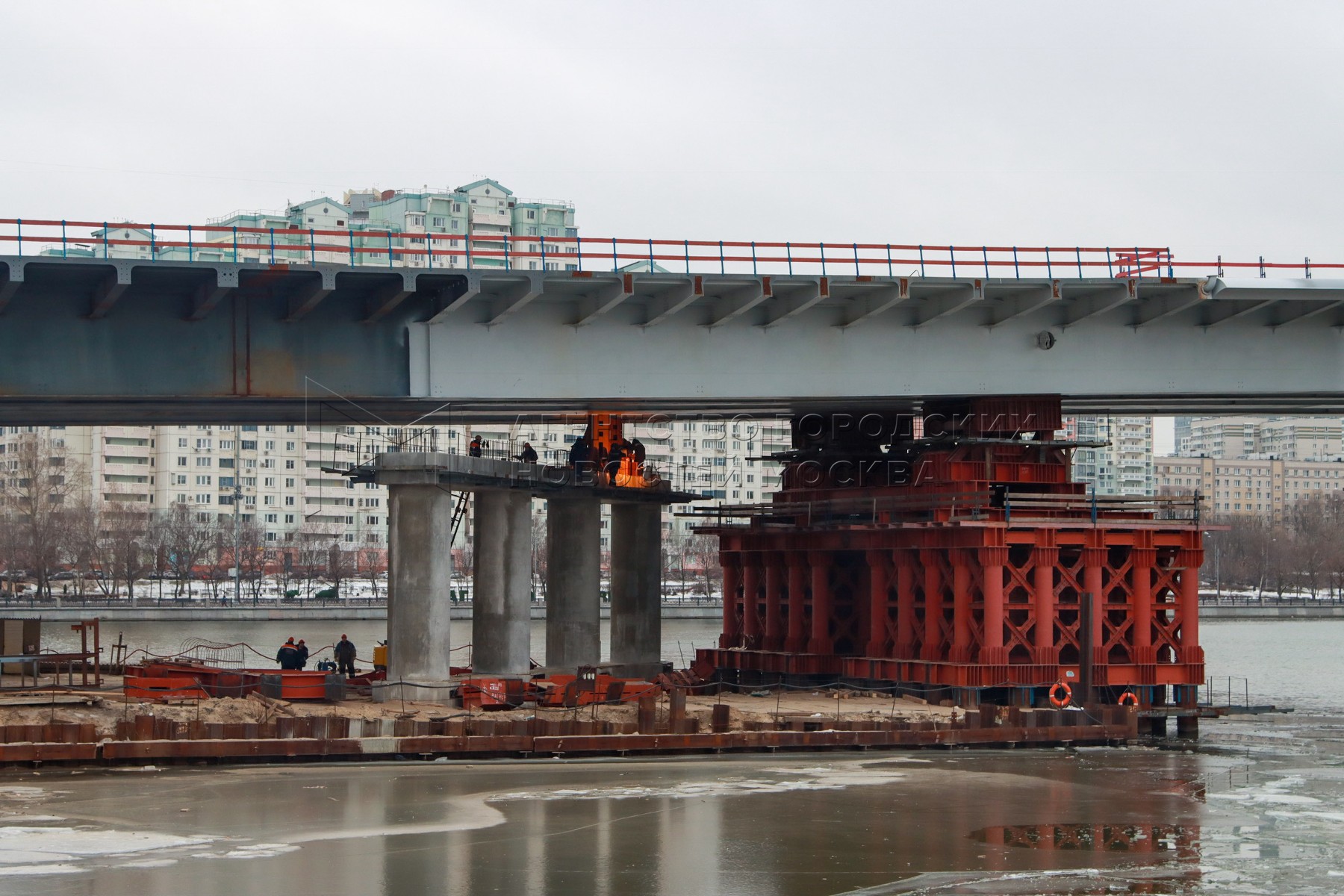 Строительство автомобильного моста через затон Новинки на набережной Марка Шагала