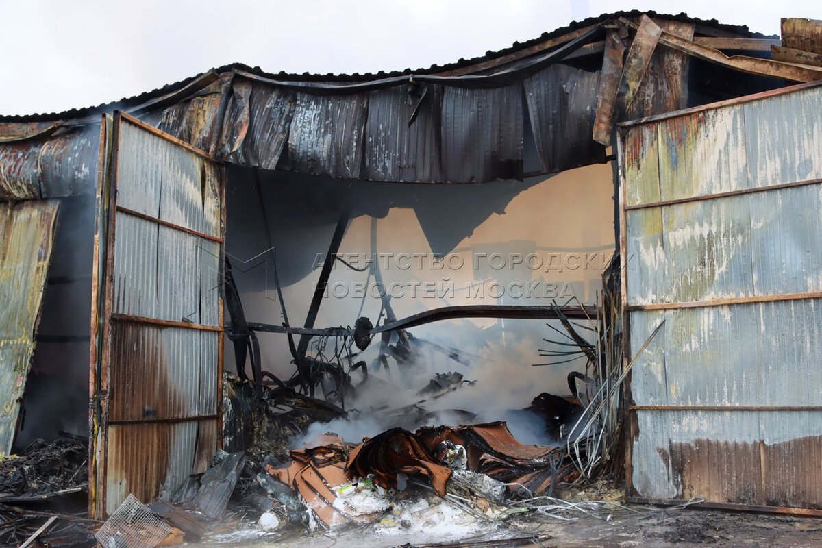 Работа пожарно-спасательных подразделений по проливке сгоревших складских помещен...