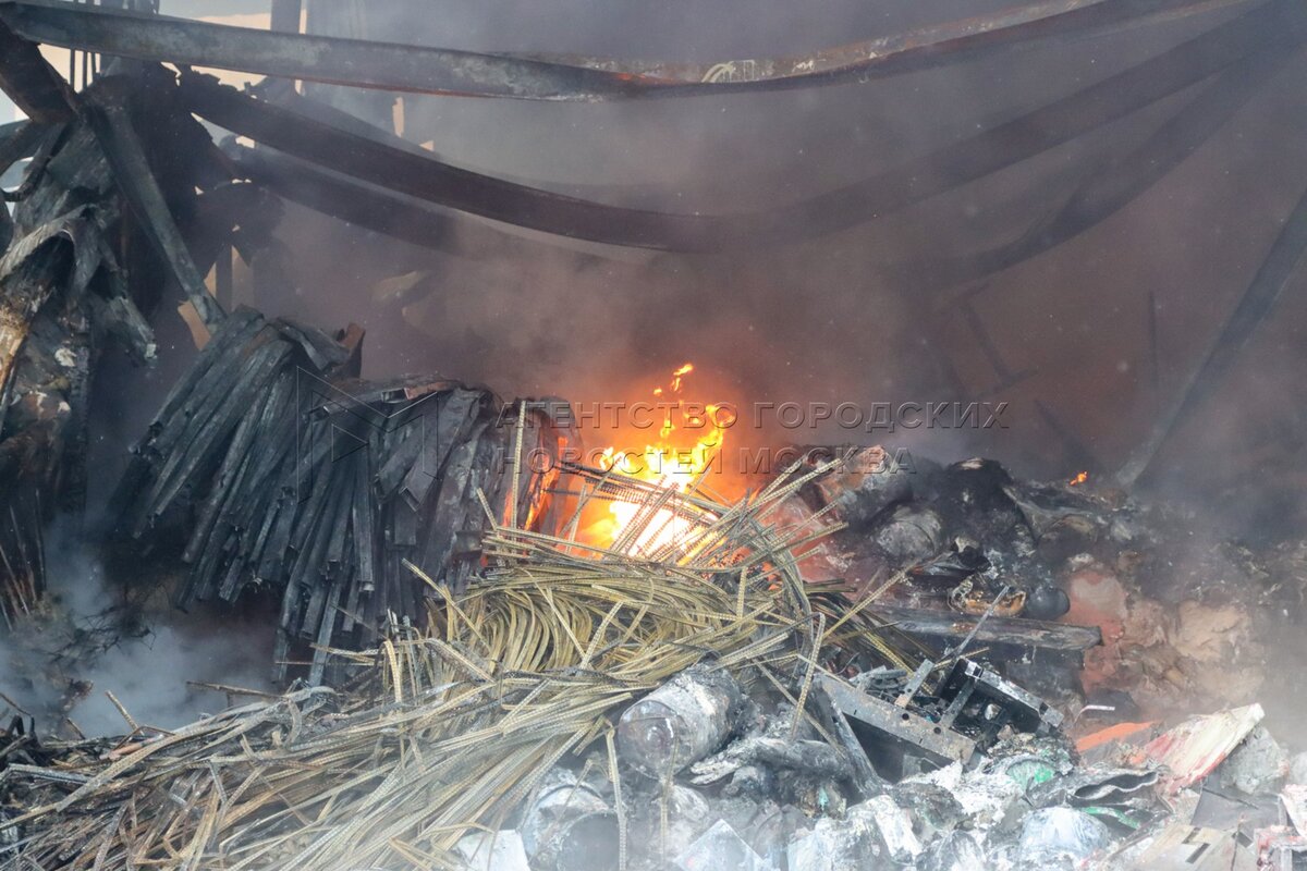 • Описание: Работа пожарно-спасательных подразделений по проливке сгоревших складских помещений на рынке стройматериалов «Синдика», расположенном на 65 км МКАД.