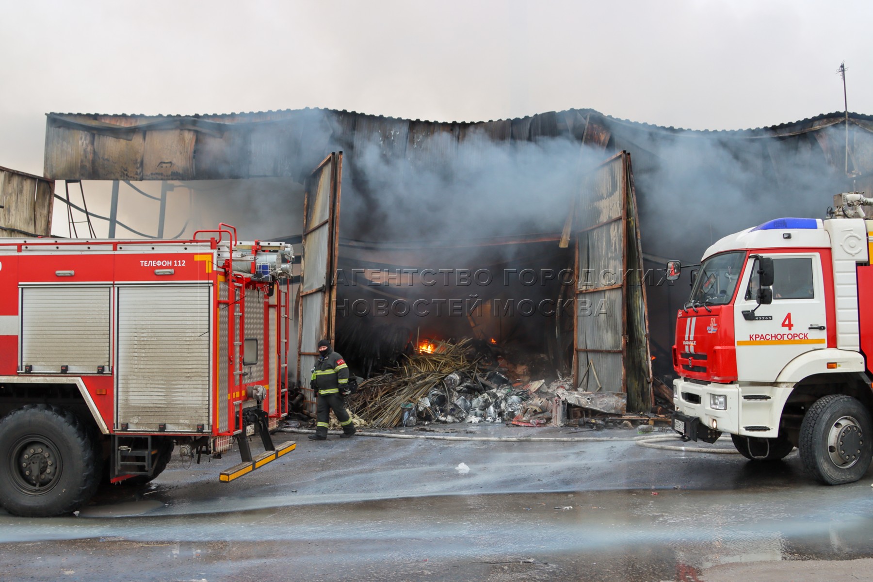 • Описание: Работа пожарно-спасательных подразделений по проливке сгоревших складских помещений на рынке стройматериалов «Синдика», расположенном на 65 км МКАД.