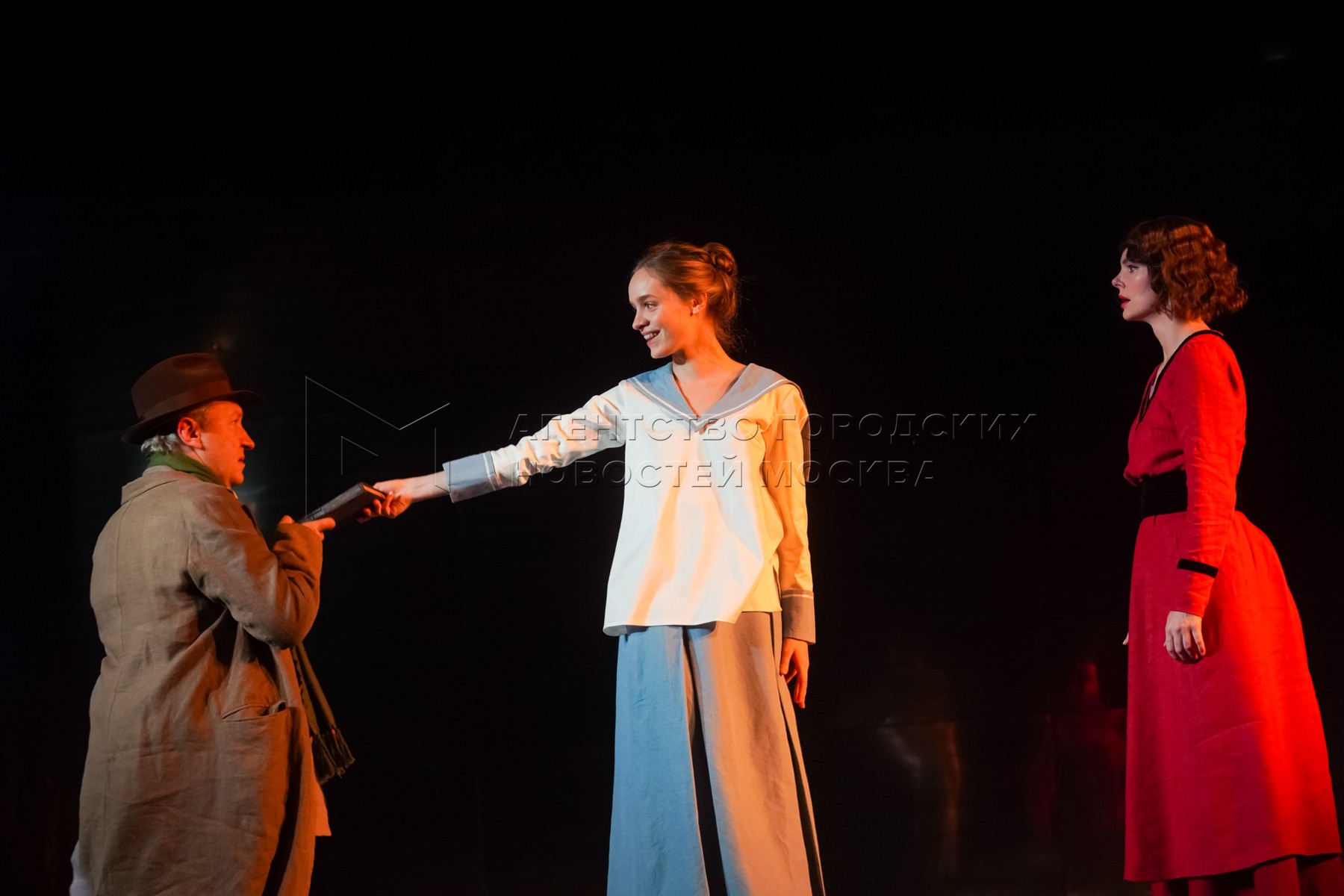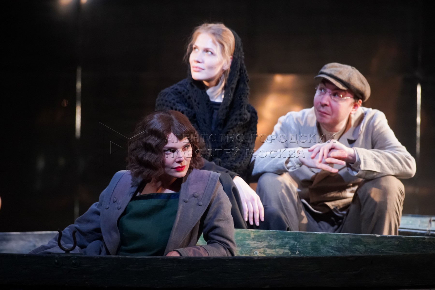 - Описание: Актеры Никита Каратаев в роли сына Аркадиной, Константина Гавриловича Треплева, Сергей Курышев в роли брата Аркадиной, Петра Николаевича Сорина и Елизавета Боярская в роли актрисы Ирины Николаевны Аркадиной (слева направо) во время генеральной репетиции спектакля «Чайка» в постановке Льва Додина на фестивале «Золотая маска».