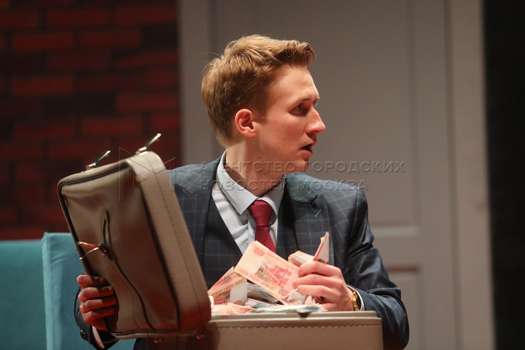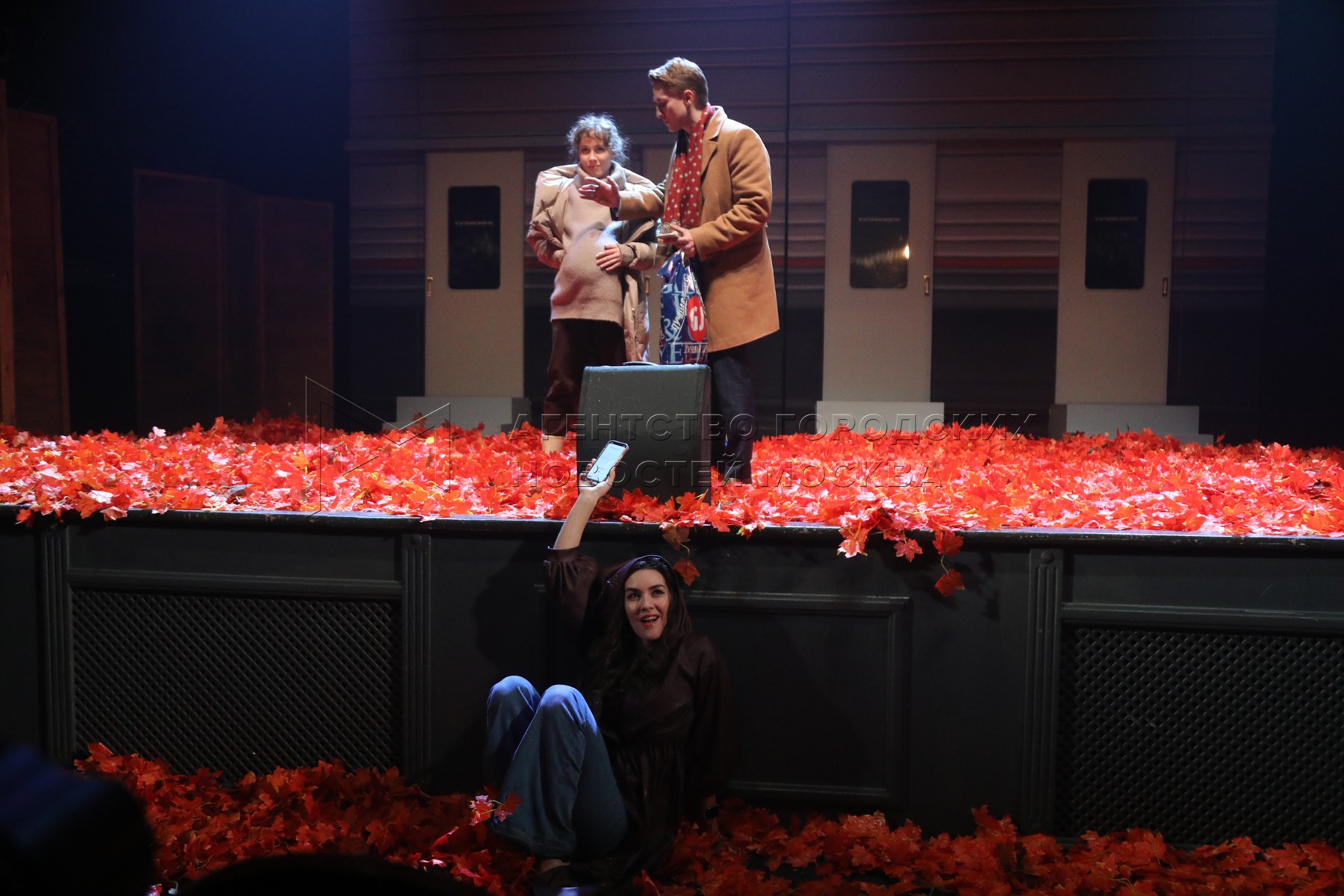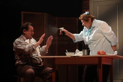 - Описание: Актеры Анастасия Дворянская в роли владелицы брачного агентства Феклы Ивановны, Леонид Громов в роли машиниста поезда на пенсии Ивана Кузьмича Колесина и Кирилл Новышев в роли Ильи Колесина (слева направо) во время показа премьерной комедии «Женитьба. Почти по Гоголю» в постановке Сергея Безрукова в Московском губернском театре.