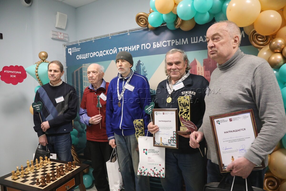 - Описание: Руководитель центра московского долголетия «Котловка» Дамир Гафуров (слева), председатель комиссии ветеранов Российской шахматной федерации Галина Дворкович и победитель общегородского турнира по быстрым шахматам Николай Иванов (третий слева) во время финала общегородского шахматного турнира в центре московского долголетия «Котловка».