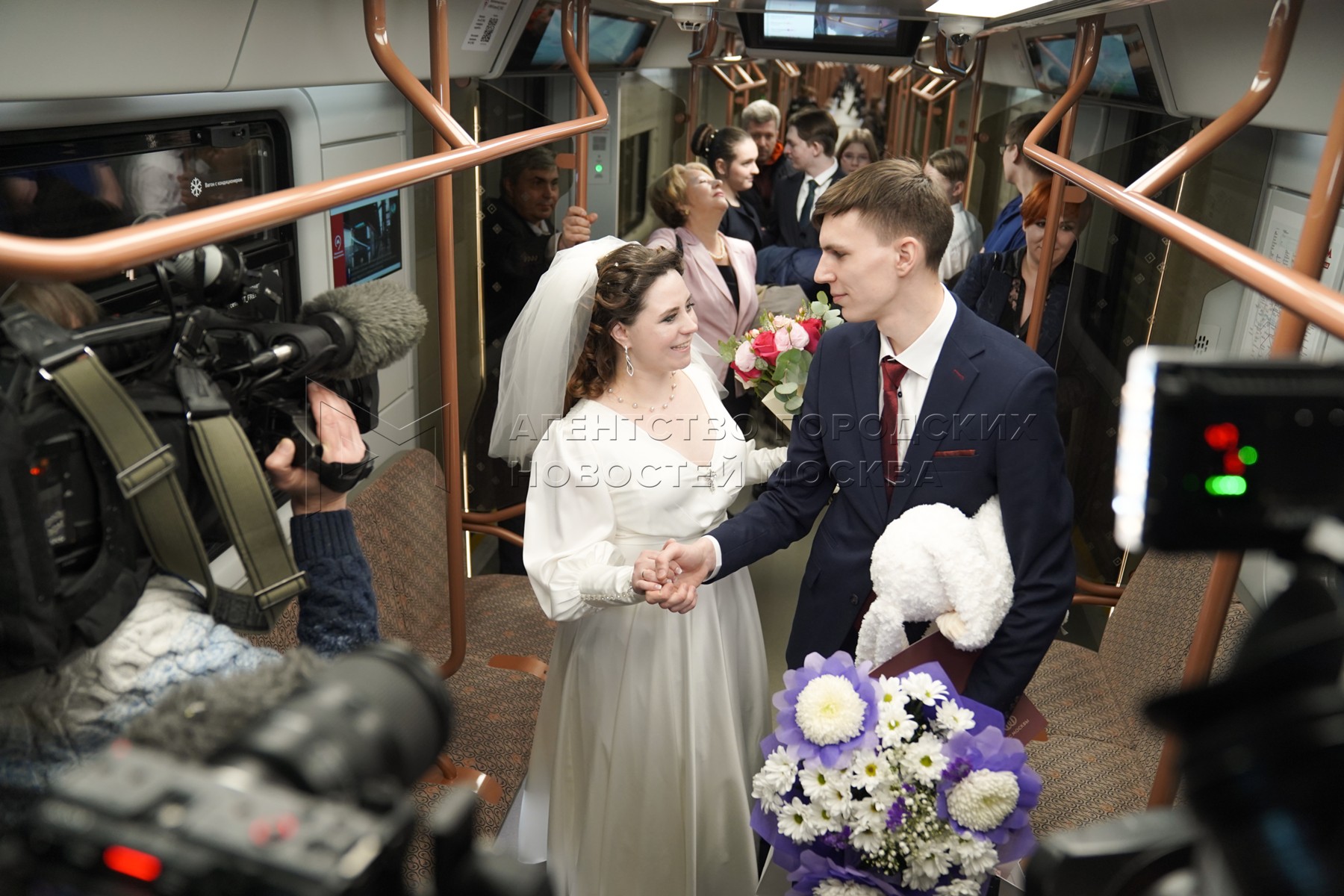 Церемония бракосочетания в поезде «Москва-2020» на Большой кольцевой линии столич...