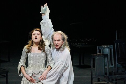 • Описание: Актеры Екатерина Крамзина в роли жены Моцарта Констанции и Алексей Гуськов в роли Антонио Сальери во время показа спектакля «Амадей» в Государственном академическом театре имени Евгения Вахтангова.