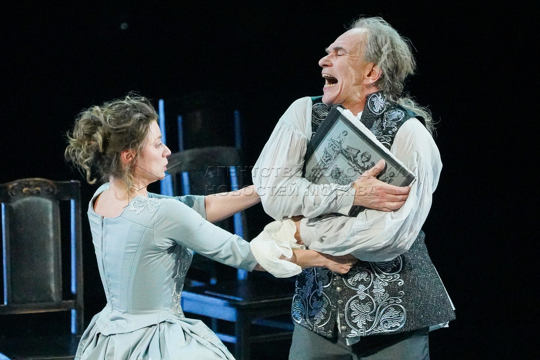 • Описание: Актеры Екатерина Крамзина в роли жены Моцарта Констанции и Алексей Гуськов в роли Антонио Сальери во время показа спектакля «Амадей» в Государственном академическом театре имени Евгения Вахтангова.
