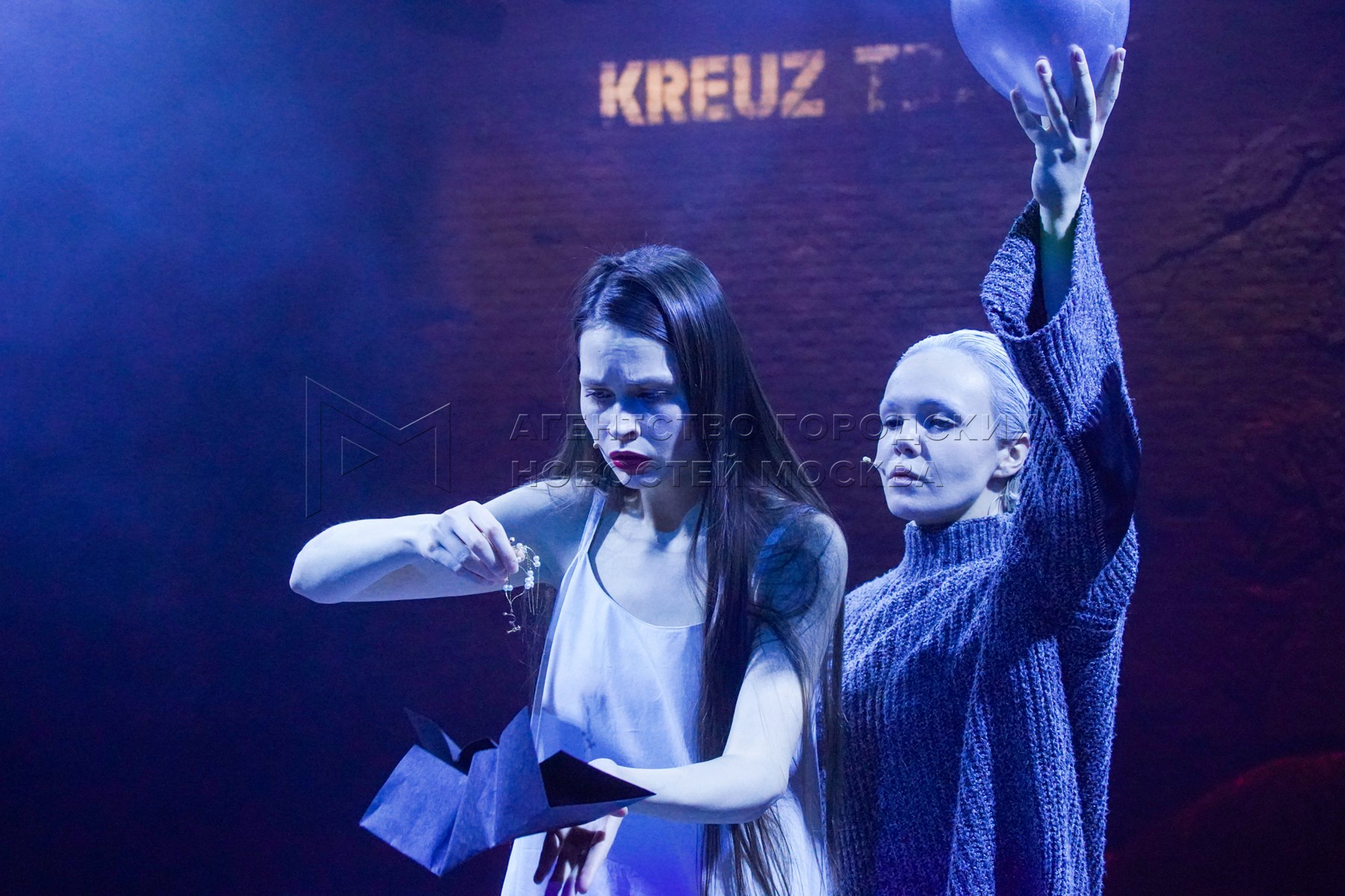 Актрисы Юлия Марычева (слева) и Валерия Куликова в роли Марии во время премьерног...