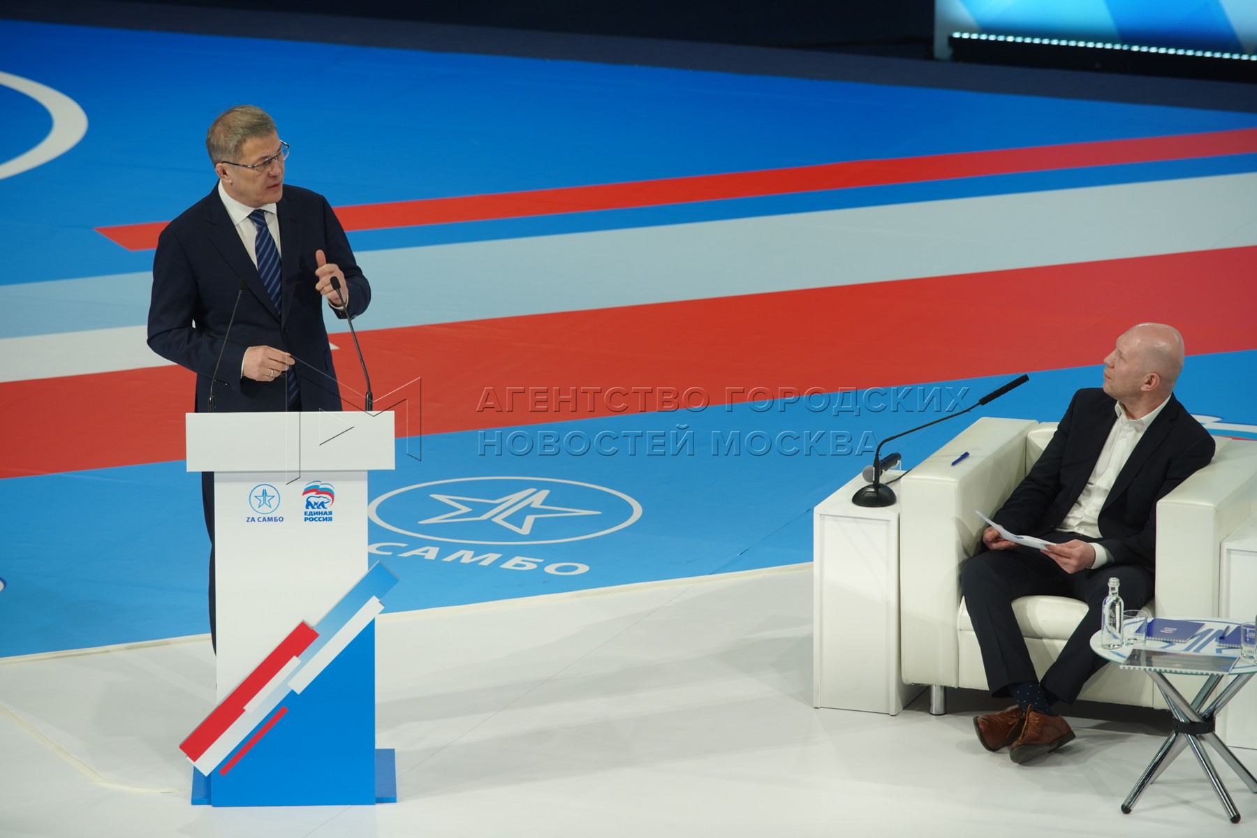 - Описание: Глава Республики Башкортостан Радий Хабиров (слева) и телеведущий Анатолий Кузичев во время заседания форума «Наука побеждать» в рамках реализации федерального проекта «Zа самбо» партии «Единая Россия» в Международном центре самбо в «Лужниках».