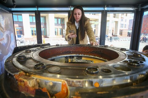 - Описание: На Манежной площади установили павильон со спускаемым аппаратом транспортного пилотируемого корабля «Союз МС-18», на котором снимали первый художественный фильм в космосе «Вызов».