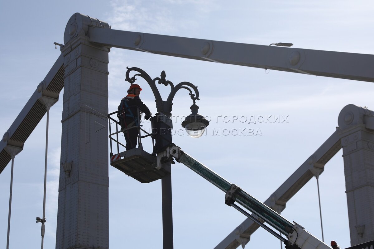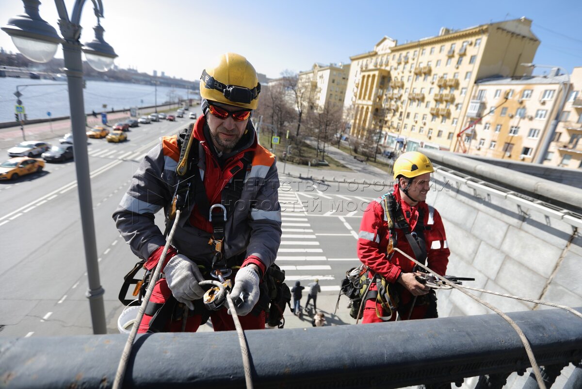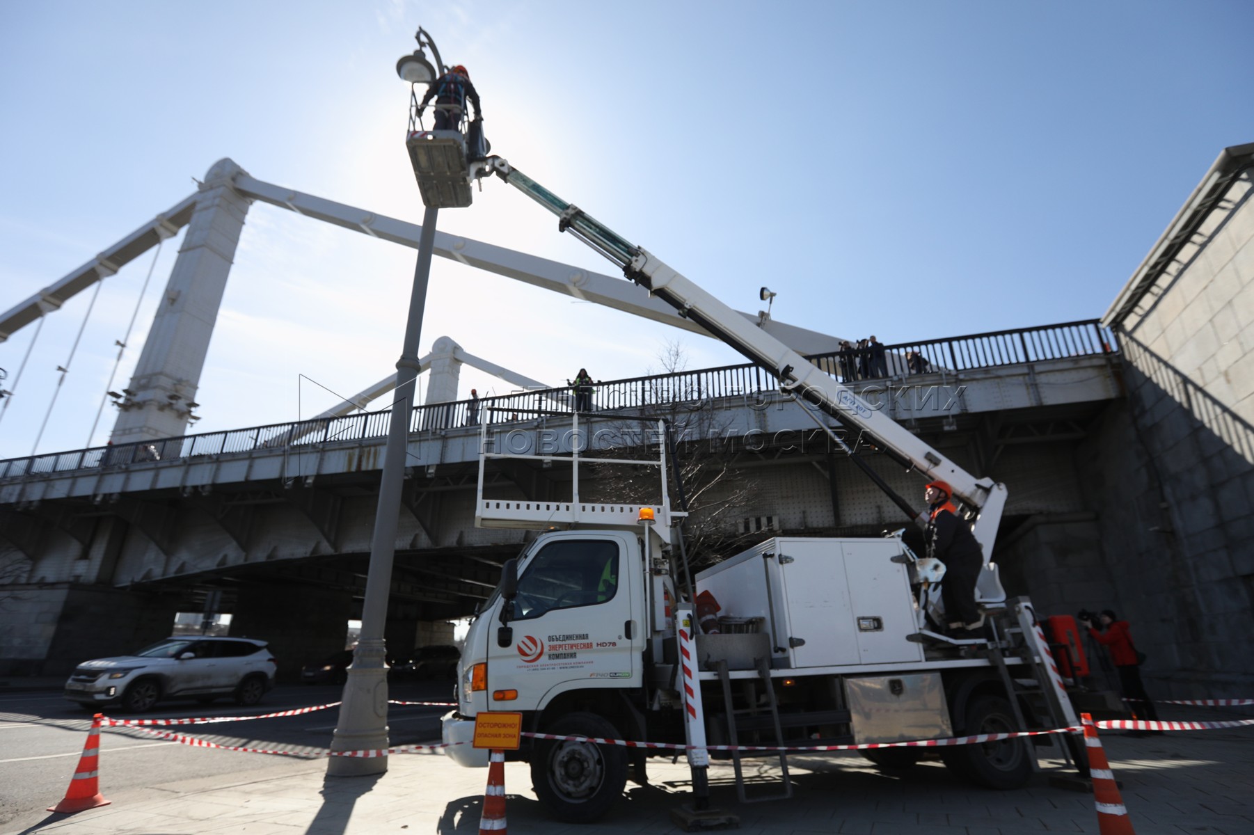 Помывка опор освещения в районе Крымского моста на Пречистенской набережной.