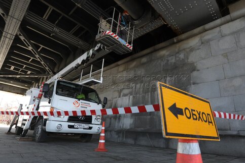 • Описание: Помывка опор освещения в районе Крымского моста на Пречистенской набережной.