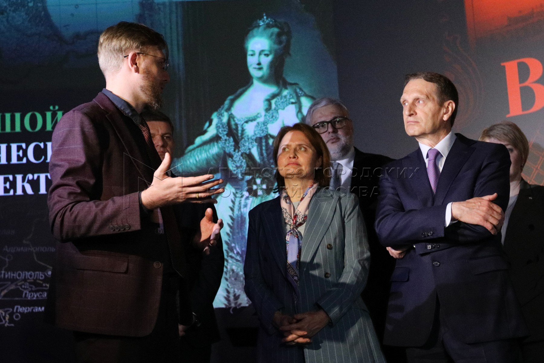 Директор парка «Россия - моя история» Денис Кузнецов, директор музея современной истории России Ирина Великанова и председатель Российского исторического общества (РИО), председатель Совета фонда «История Отечества», директор Службы внешней разведки (СВР) РФ Сергей Нарышкин (слева направо) во время открытия выставки «Русский Азов» в мультимедийном историческом парке «Россия - моя история» на ВДНХ.