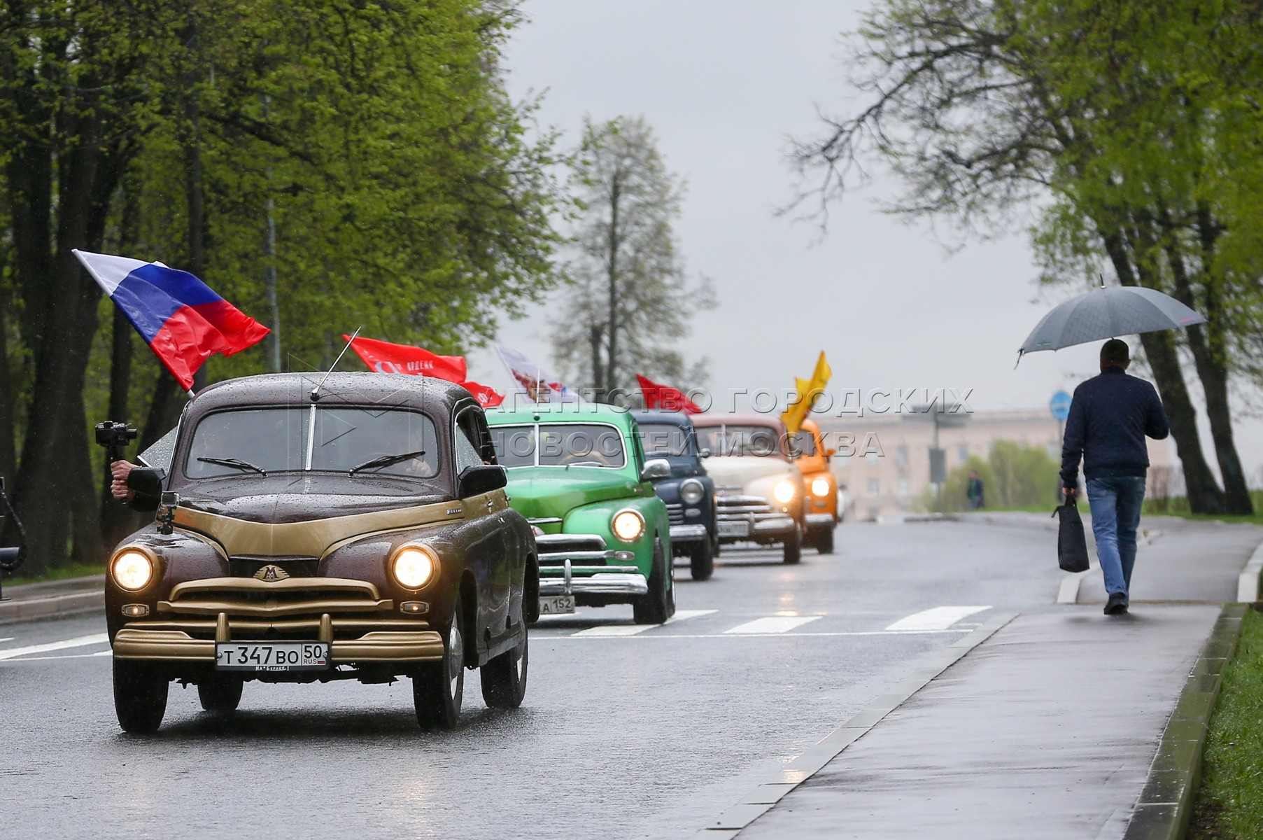 Автомобили Победа во время старта автопробега ретромашин у Музея Победы на Поклон...