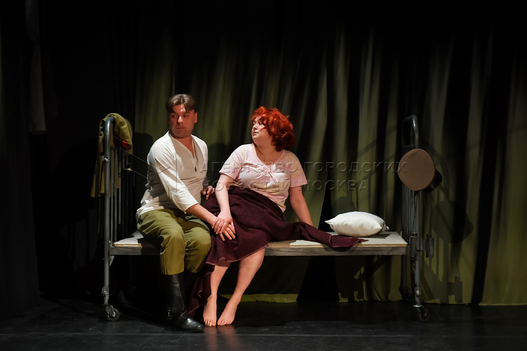 - Описание: Актеры Максим Лебедев в роли Васкова и Анастасия Савицкая в роли Марьи Никифоровны во время благотворительного премьерного показа спектакля «А зори здесь тихие» для ветеранов города Москвы в Театре Луны на Малой Ордынке.