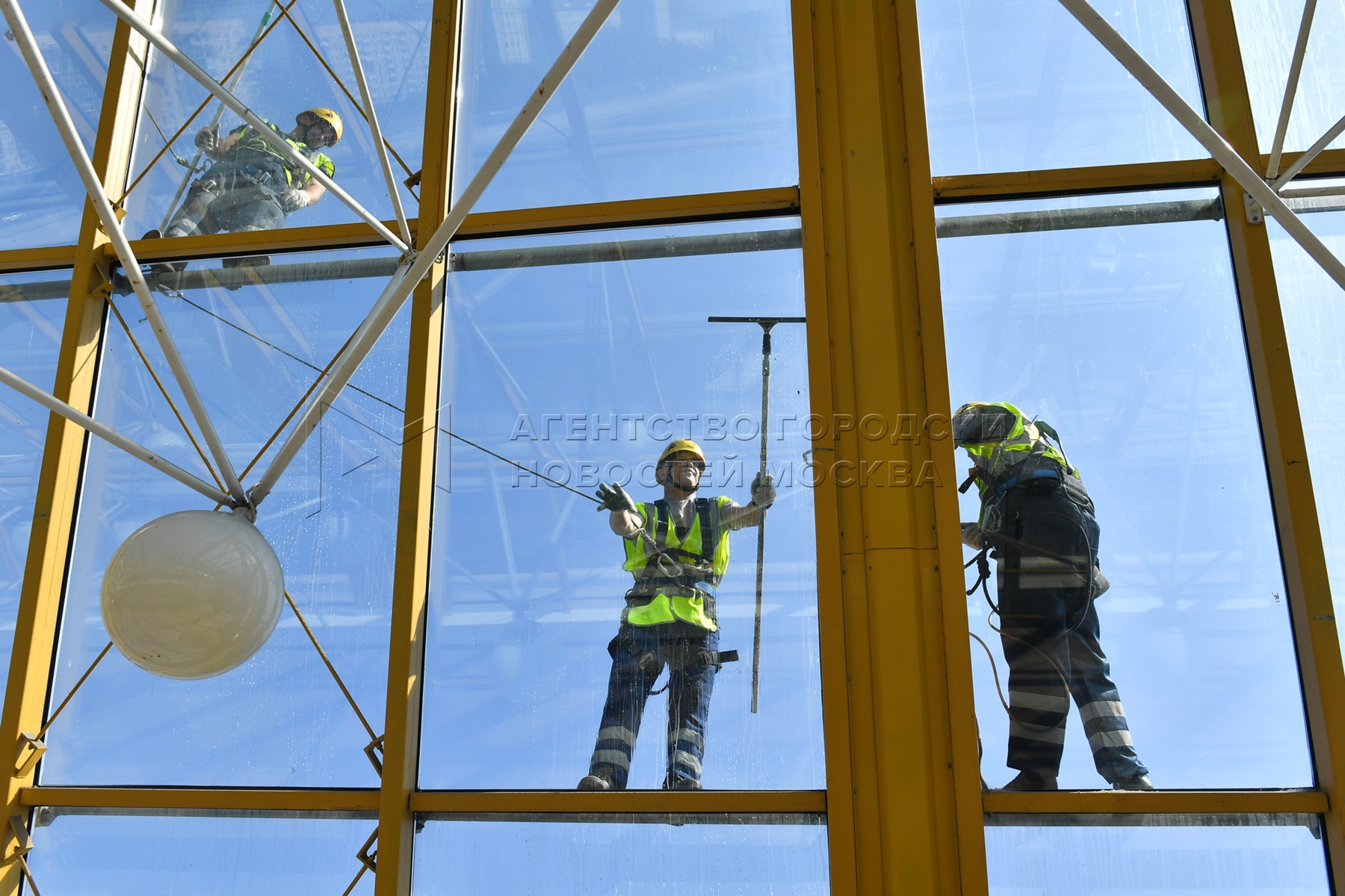 Промывка стекол на пешеходном мосту Богдана Хмельницкого через Москву-реку, соеди...