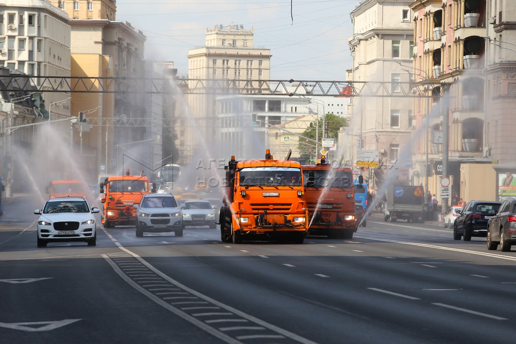 Увлажнение воздуха и охлаждение дорожного покрытия в связи с жаркой погодой в Москве.