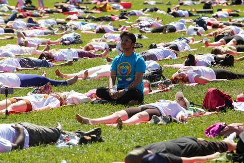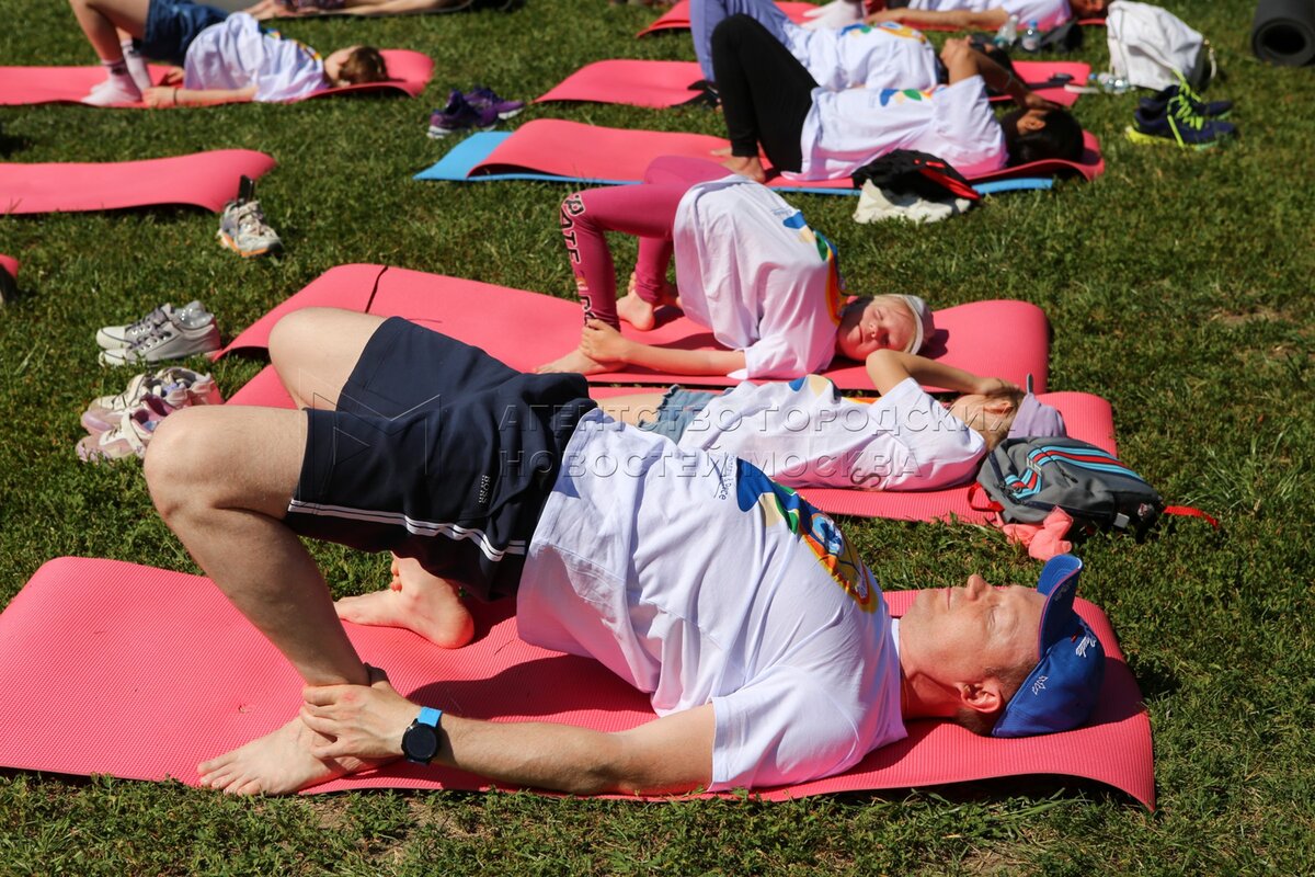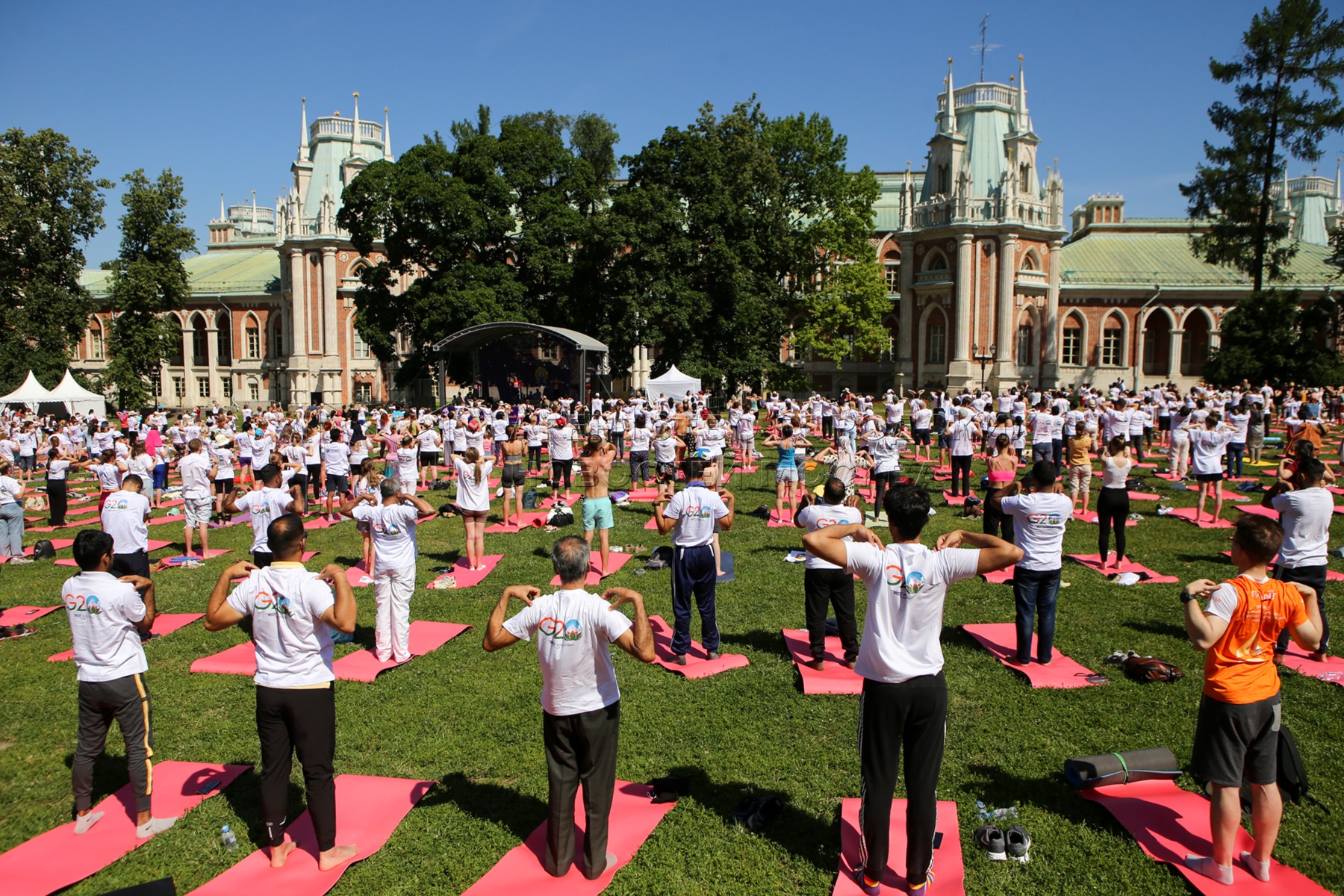Уроки йоги и медитации от мастеров и гуру из Культурного центра имени Джавахарлала Неру при посольстве Индии в Москве в рамках девятого Международного дня йоги в музее-заповеднике «Царицыно».