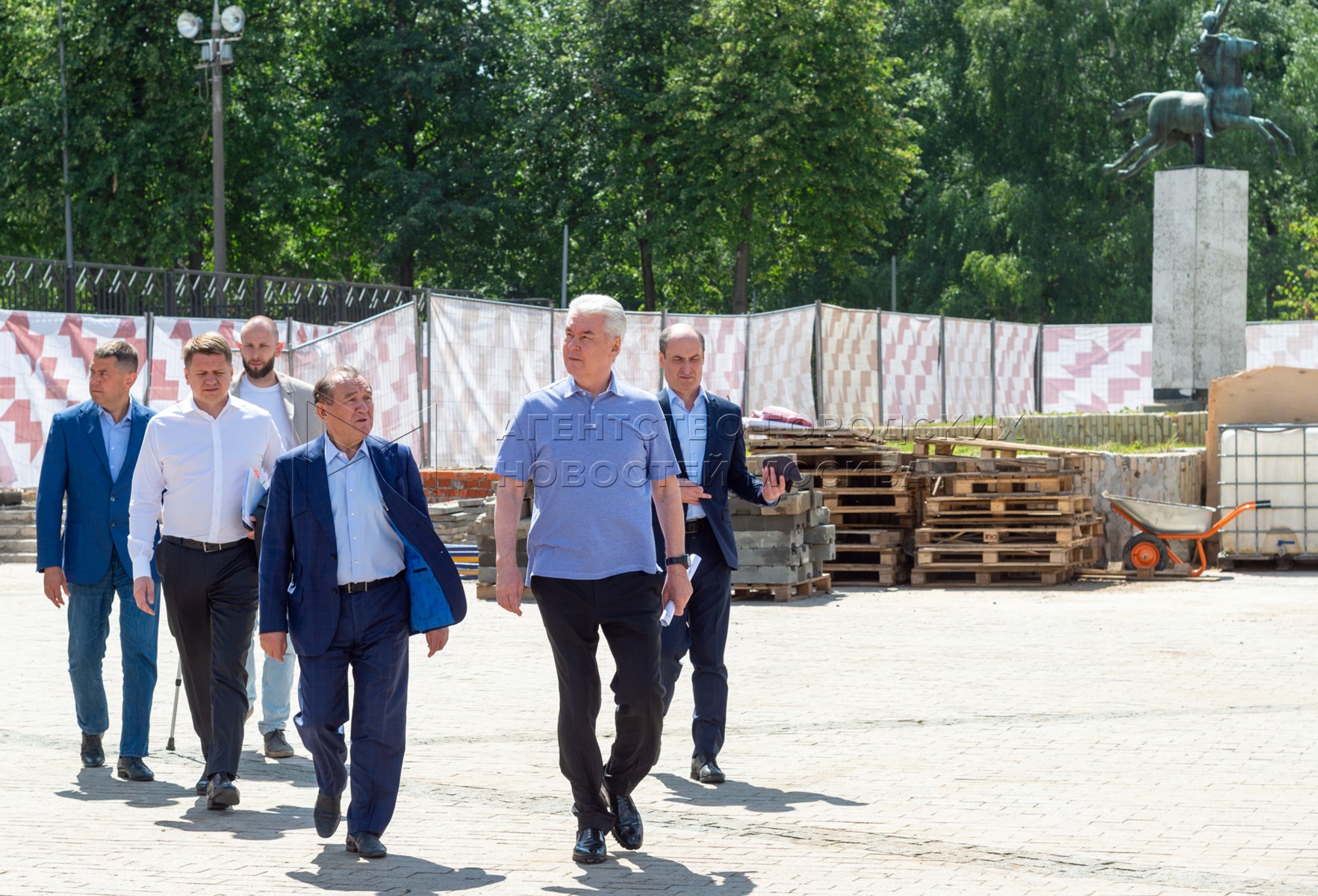 Мэр Москвы Сергей Собянин (в центре) во время осмотра хода реставрации исторических зданий Дворца пионеров на Воробьевых горах и комплексного благоустройства парка имени 40-летия ВЛКСМ. Фото: Максим Мишин, пресс-служба мэра и правительства Москвы.
