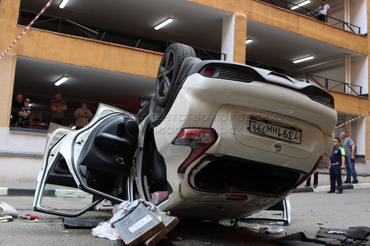 Последствия падения автомобиля со второго этажа паркинга в ТЦ «Филион» в Багратио...