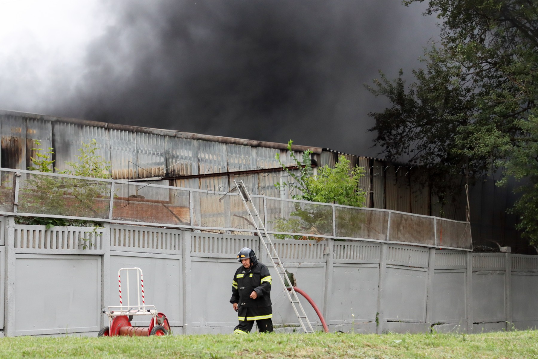 • Заголовок: Работа пожарных расчетов на месте возгорания в автосервисе на улице Подольских Курсантов
