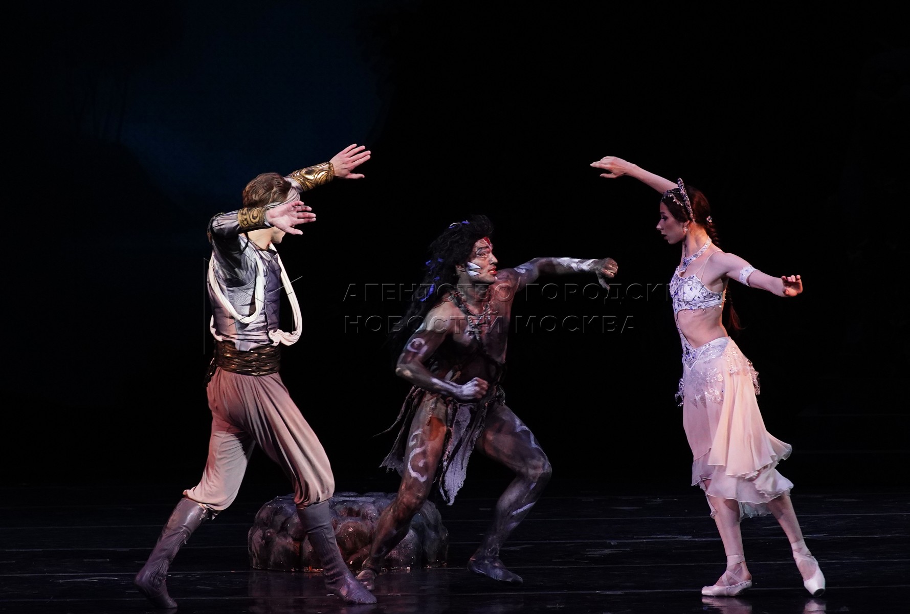 Второй солист театра Никита Кириллов в роли Дугманты (в центре) во время балета «Баядерка» в Московском академическом музыкальном театре имени Станиславского и Немировича-Данченко.