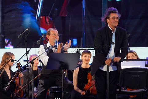 Дирижер Юрий Башмет (слева), чтец Константин Хабенский и выступление Всемирного ю...