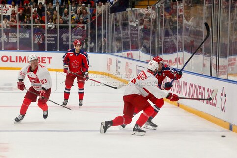 - Описание: Нападающий ХК ЦСКА Максим Мамин (слева) и защитник ХК «Спартак» Семен Ручкин во время финала Кубка мэра Москвы по хоккею между ХК ЦСКА и ХК «Спартак» во дворце спорта «Мегаспорт» имени Тарасова.