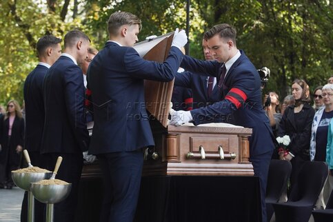 Сын Г. Панфилова Иван (в центре) во время гражданской панихиды и церемонии прощан...