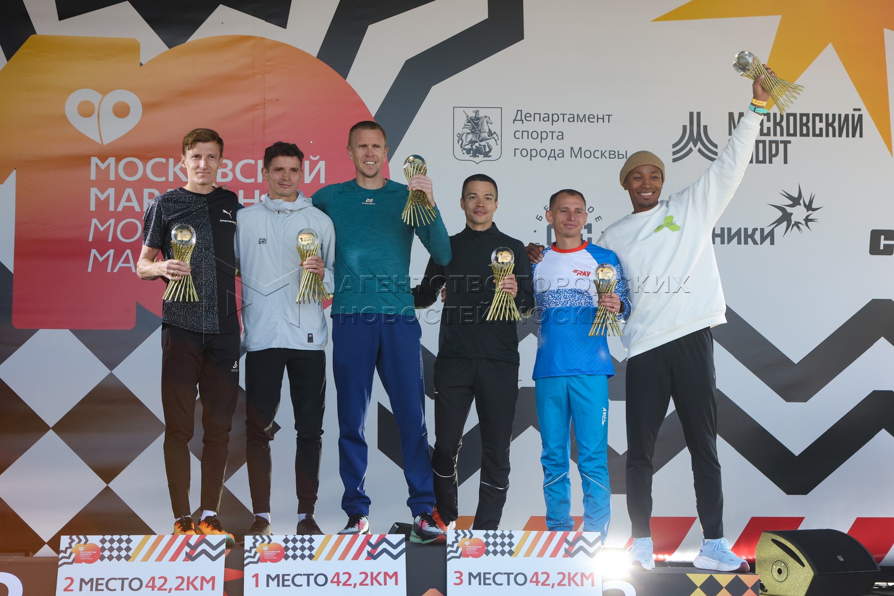 - Описание: Призеры Московского марафона – 2023 в забеге на 42 км – Степан Киселев (второе место), Дмитрий Неделин (первое место), Алексей Трошкин (третье место) (слева направо) на церемонии награждения.