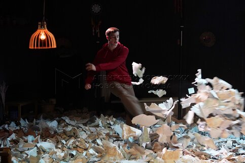 Актер Сергей Кирпиченок в роли Сына во время премьерного показа спектакля «Долгие...