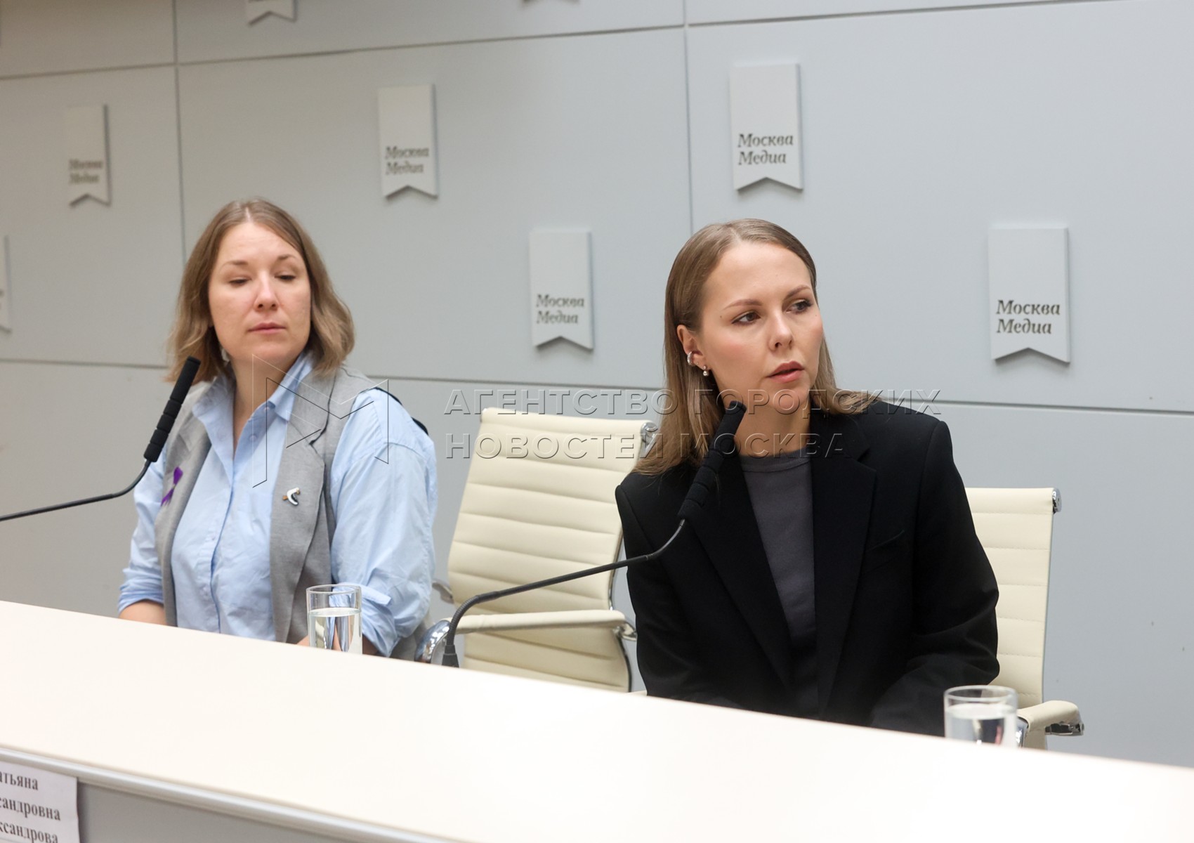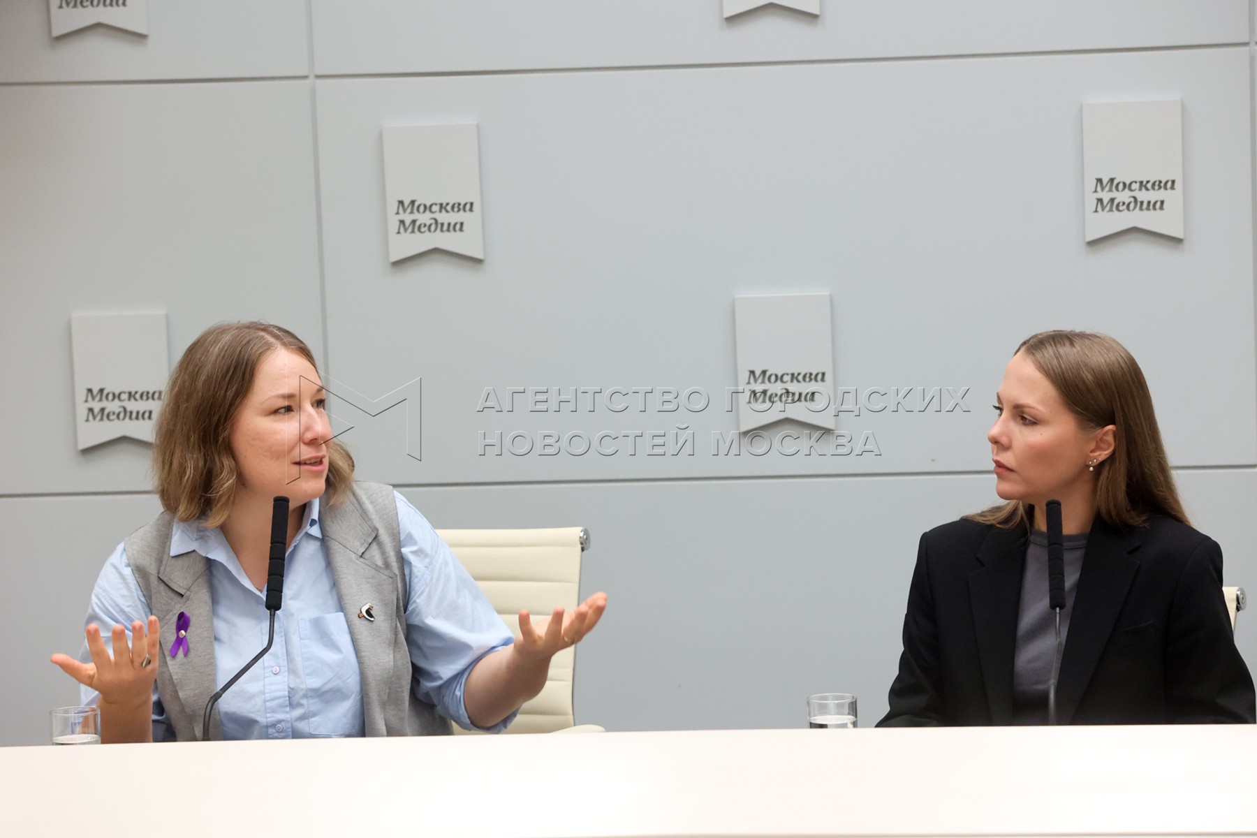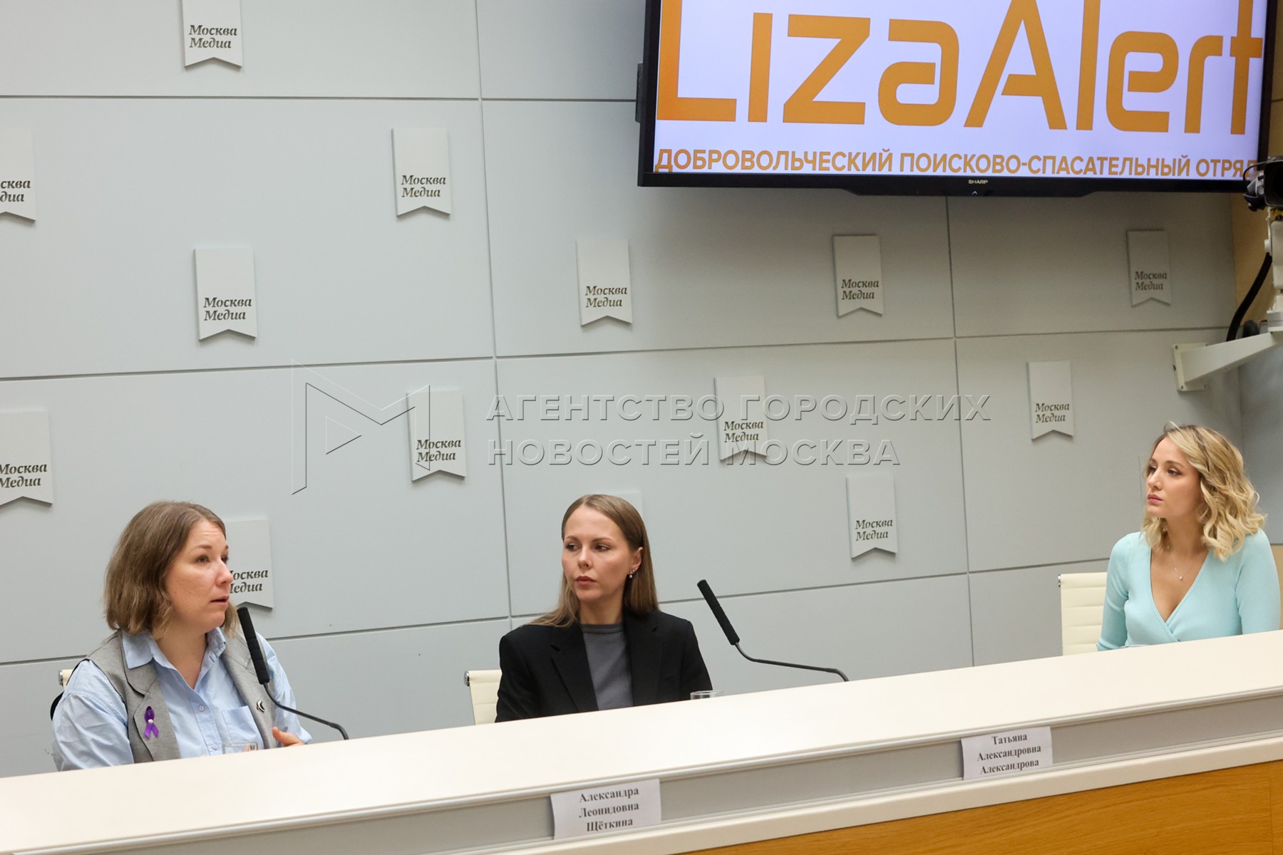 - Описание: Президент фонда помощи людям с деменцией и их семьям «Альцрус» Александра Щеткина (слева) и координатор поисково-спасательного отряда «ЛизаАлерт» Татьяна Александрова во время пресс-конференции «Жизнь с деменцией: каким рискам она подвергает заболевших, и как защититься от них?».