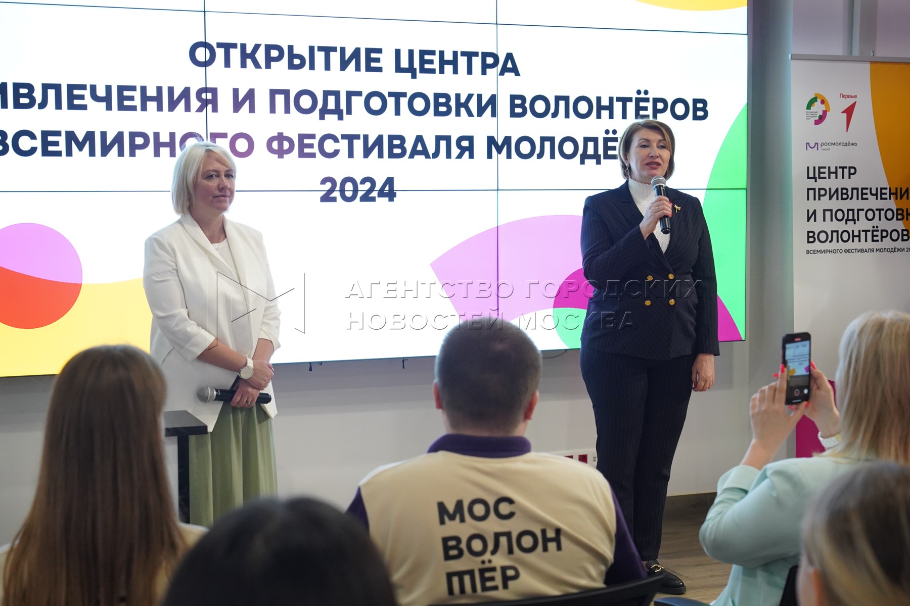 - Описание: Председатель Комитета общественных связей и молодежной политики города Москвы Екатерина Драгунова (слева) и заместитель генерального директора по региональному взаимодействию Дирекции Всемирного фестиваля молодежи Лариса Сулима во время открытия центра привлечения и подготовки волонтеров для Всемирного фестиваля молодежи – 2024 в ресурсном центре «Мосволонтер».
