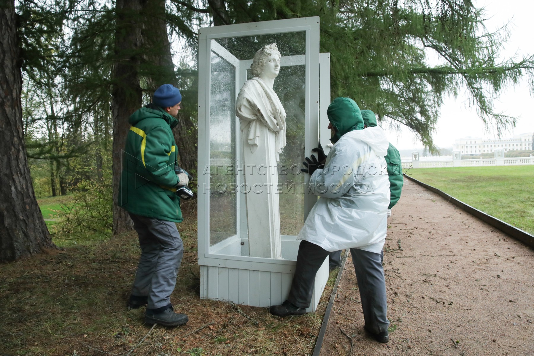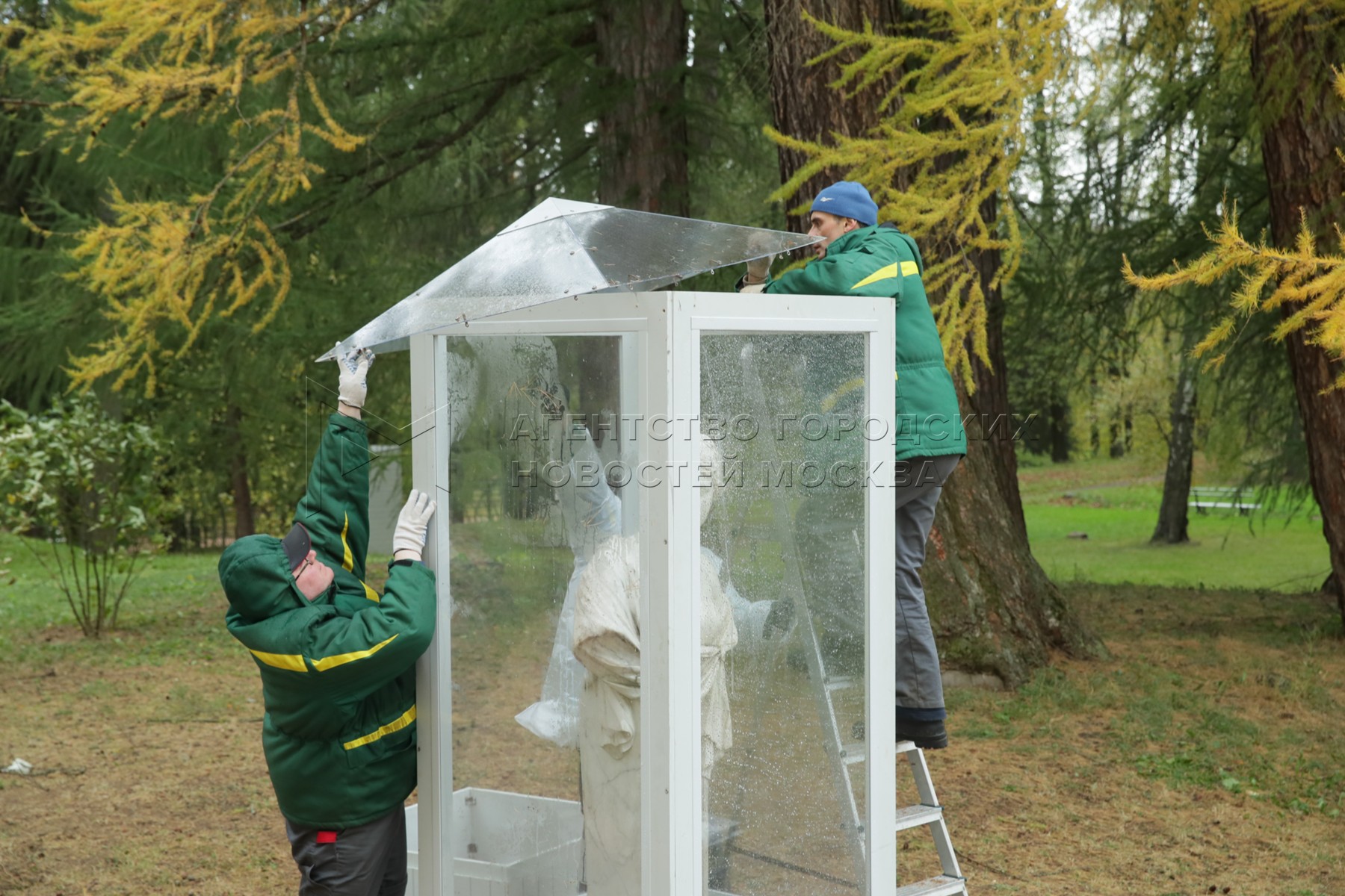 Укрытие на зиму парковых скульптур в музее-заповеднике «Архангельское» в Московск...
