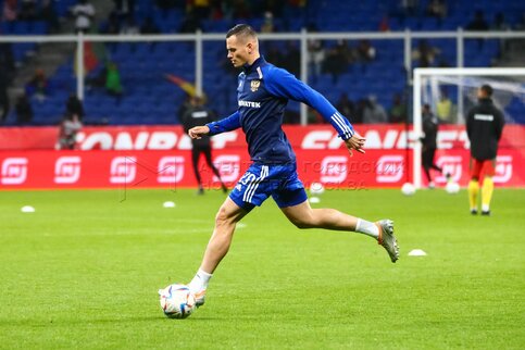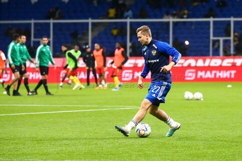 Игрок сборной России Максим Мухин (справа второй) на товарищеском матче по футбол...