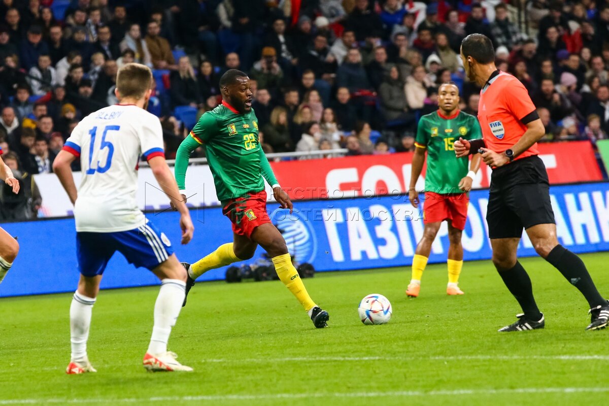 Игрок сборной Камеруна Венсан Абубакар (слева) и игрок сборной России Дмитрий Бар...