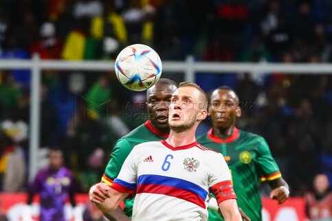 Игрок сборной Камеруна Венсан Абубакар (слева) и игрок сборной России Дмитрий Бар...