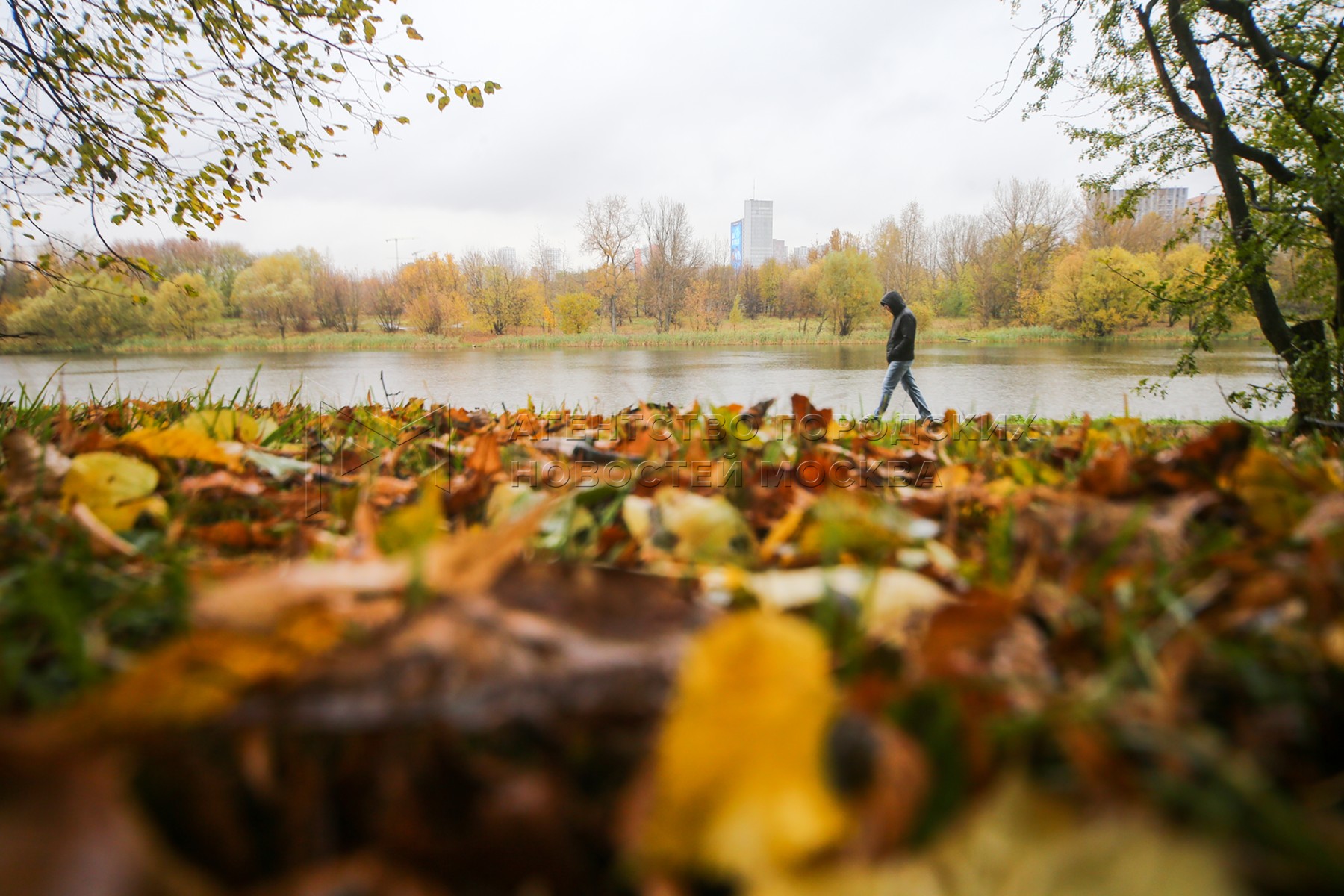 Дождливая погода в Москве 16 октября 2023 года. Собака в комбинезоне на прогулке.