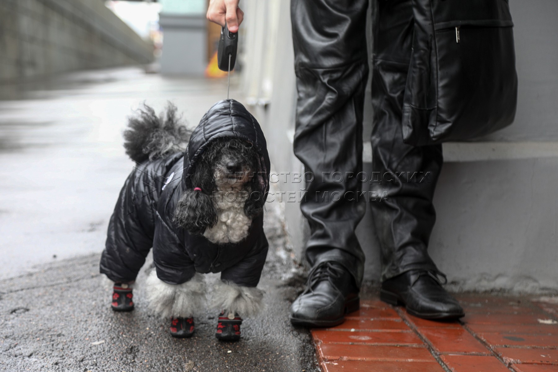 • Описание: Дождливая погода в Москве 16 октября 2023 года. Собака в комбинезоне на прогулке.