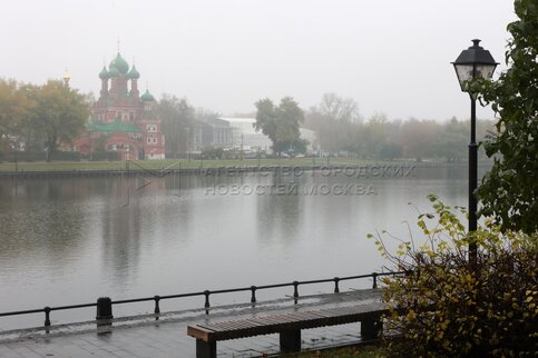 Останкинский пруд, вид на храм Живоначальной Троицы в Останкине. Сильный туман в ...