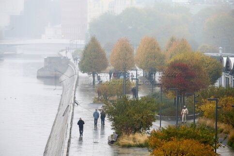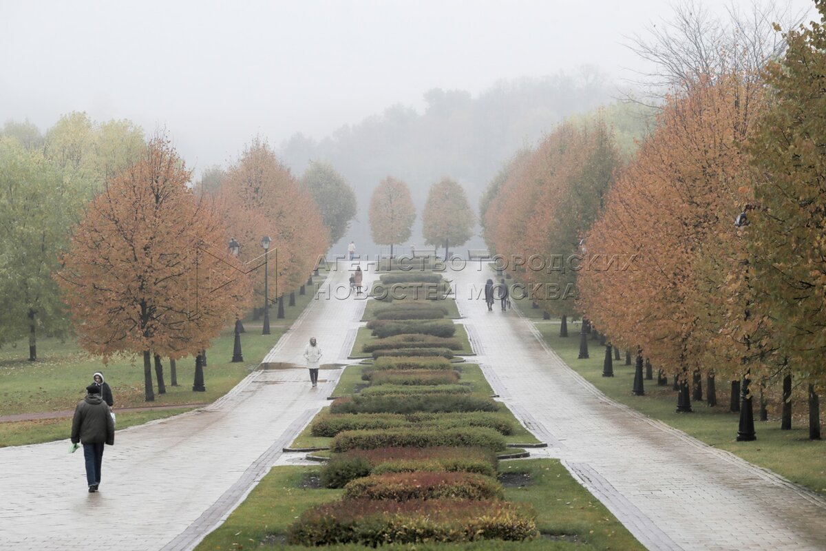 Пешеходная зона в парке. Сильный туман в Москве 23 октября 2023 года.