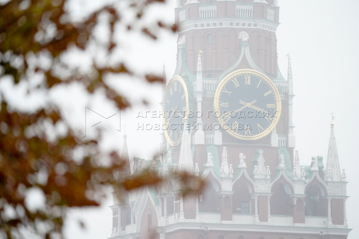 Горожане на фоне Спасской башни Кремля. Сильный туман в Москве 23 октября 2023 го...